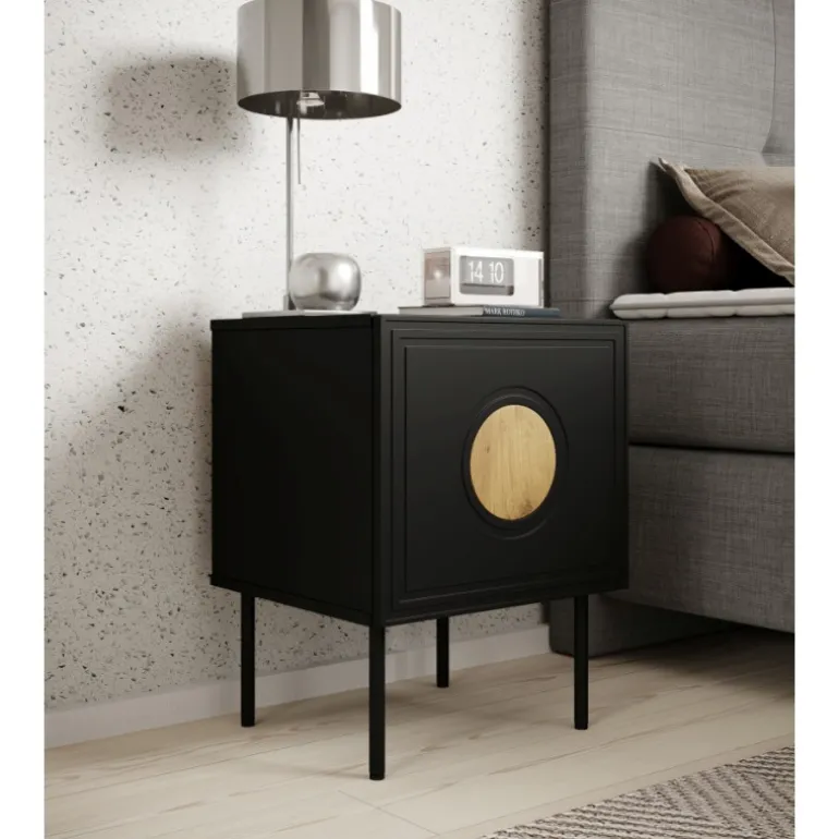 Opgrader dit soveværelse med PALAZZO natbord. Dette stilfulde sæt indeholder to natborde, der kombinerer funktionalitet og moderne design. Med dimensioner på højde: [h] cm, bredde: [w] cm, dybde: [d] cm, passer det perfekt ved siden af din seng. Kroppen er lavet af mat lamineret spånplade på 16 mm, mens fronten er af MDF-plade på 16 mm, hvilket sikrer både holdbarhed og æstetisk appel. De Sorte metalben på 20 cm giver en elegant kontrast og øger stabiliteten. Håndtaget med PUSH-CLICK systemet gør det nemt at åbne og lukke skufferne uden besvær.