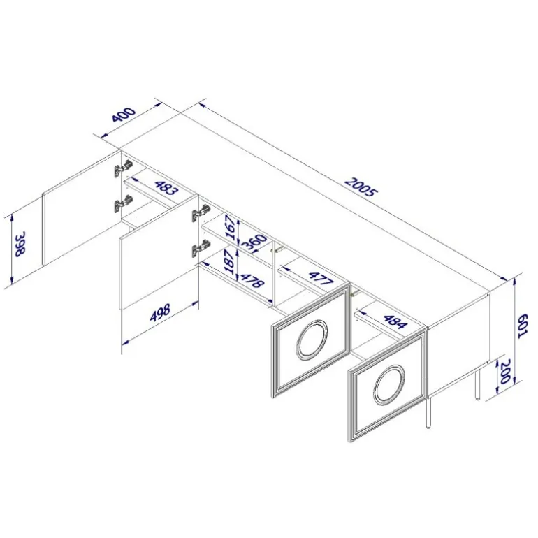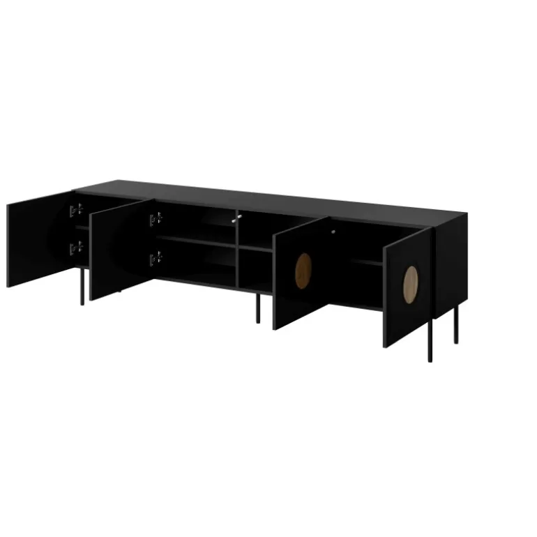 Oplev den perfekte kombination af stil og funktionalitet med PALAZZO TV bord 200 (4D). Med målene h/b/d cm/cm/cm passer denne TV bord perfekt ind i ethvert moderne hjem. Fremstillet af mat lamineret spånplade og MDF-front, sikrer den en robust og elegant opbevaringsløsning. Metalfødderne i Sort farve giver et moderne touch, og håndtagssystemet PUSH – CLICK gør det nemt at åbne og lukke skabene. PALAZZO TV bord er ideel til at organisere dit underholdningsområde med stil og elegance.