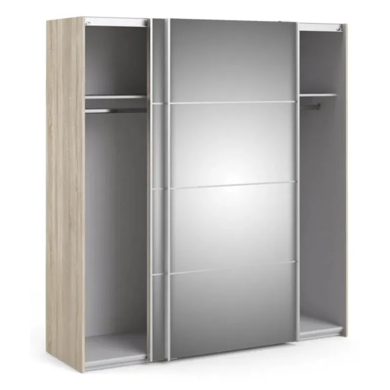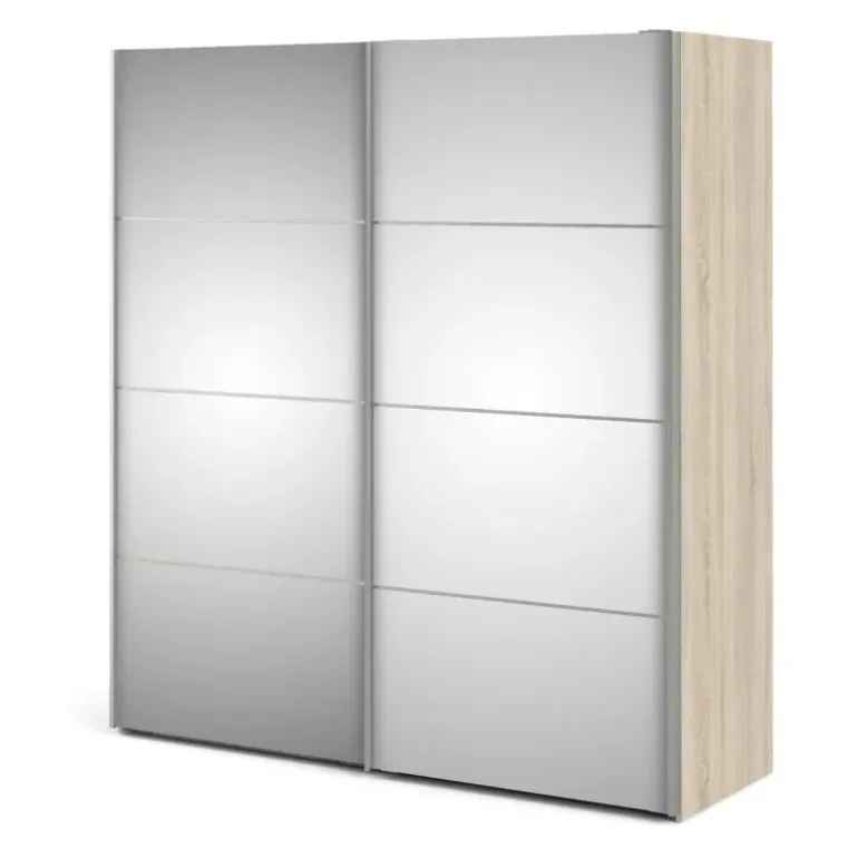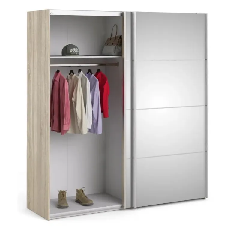 Palermo fra Tvilum er garderobeskabe med 2 x skydelåger i glas til dig, som gerne vil have et godt garderobeskab til en fair pris. Skabet er i hvid med 2 spejllåger. Skabet indeholder 2 bøjlestænger og 2 fastmonteret hylder 182 cm bred. Kollektionen består af klædeskabe i 2.0 meters højde i tre bredder, der alle har gode skydelåger. Korpus og låger er fremstillet i en 15 mm. profil. Garderobeskabe er fremstillet og designet i Danmark.