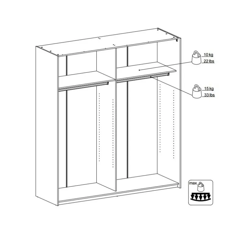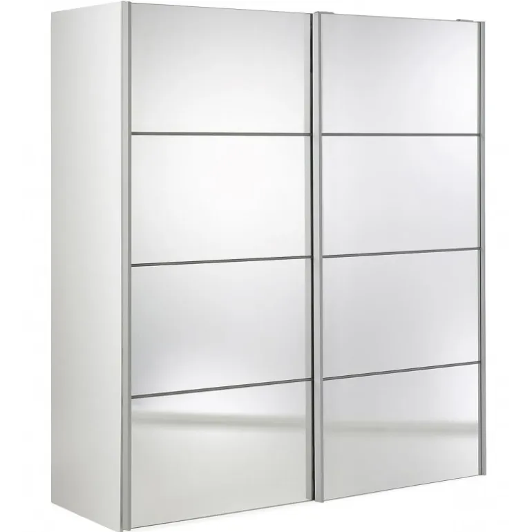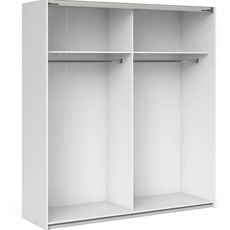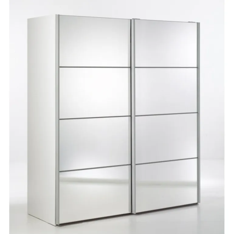 Palermo fra Tvilum er garderobeskabe med skydelåger til dig, som gerne vil have et godt garderobeskab til en fair pris. Skabet er i hvid med 2 spejllåger. Skabet indeholder 2 bøjlestænger og 2 fastmonteret hylder 182 cm bred. Kollektionen består af klædeskabe i 2.0 meters højde i tre bredder, der alle har gode skydelåger. Korpus og låger er fremstillet i en 15 mm. profil. Garderobeskabe er fremstillet og designet i Danmark.