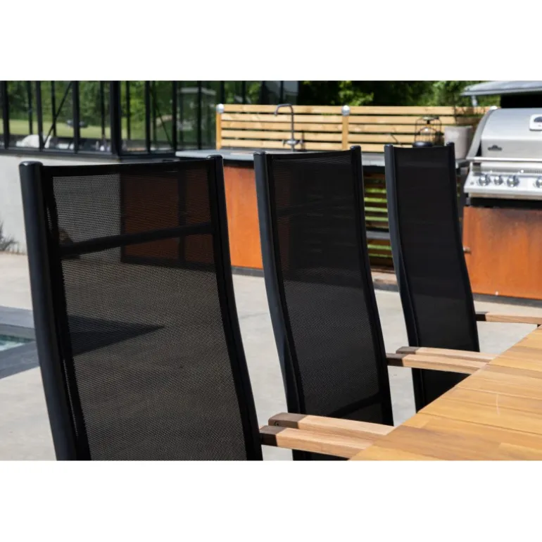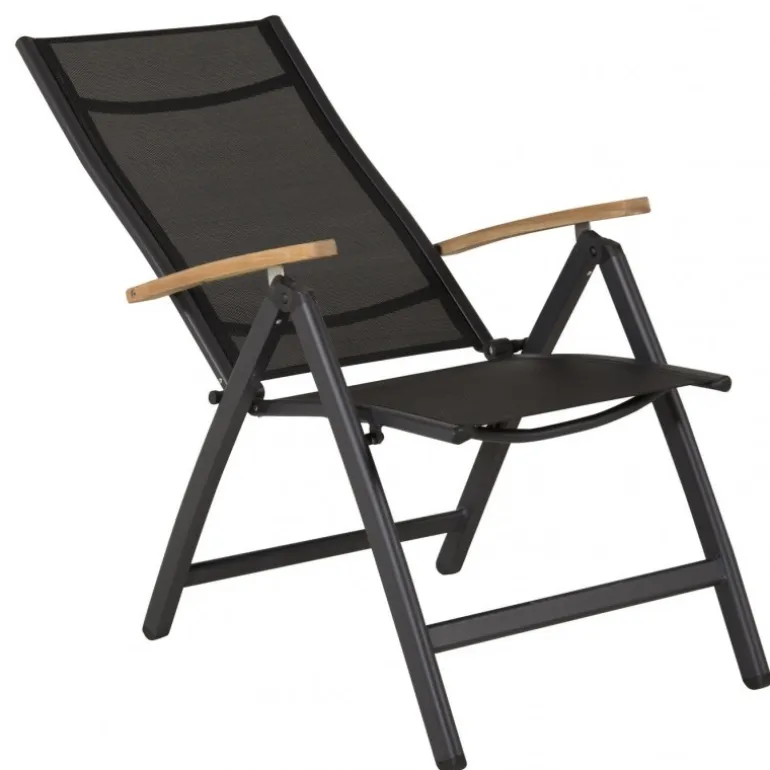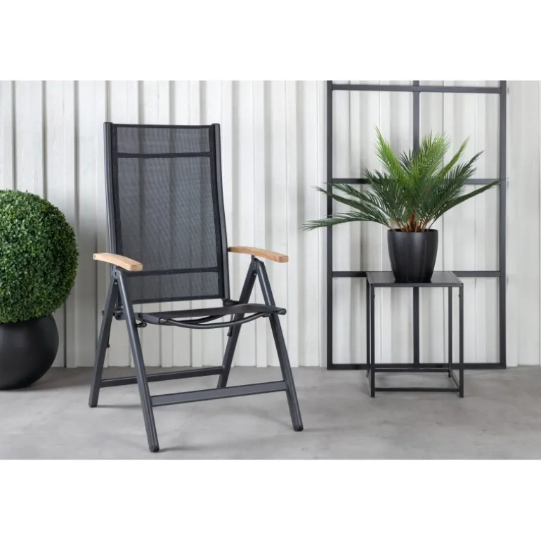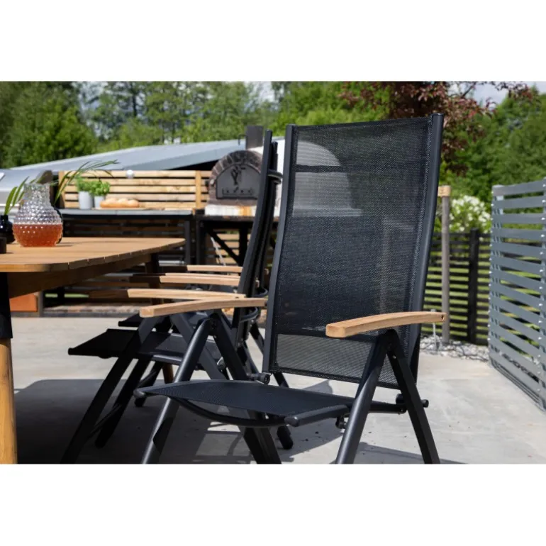 Panama, en sort sammenklappelig spisebordsstol tilpasset udendørs brug. Med smagfulde armlæn i teak får stolen et pompøst udtryk, der passer til mange smagsretninger. Stolen fungerer lige så godt til moderne som klassiske spiseborde. Juster ryglænet for optimal komfort og nyd mange dejlige sommerdage sammen! Plejeråd: Textilene er et syntetisk stof lavet af PVC-behandlet polyester. Materialet er vandafvisende og UV-behandlet for at modvirke solens blegning. Rengøring bør foretages cirka en gang om måneden; brug en fugtig klud og tør af.