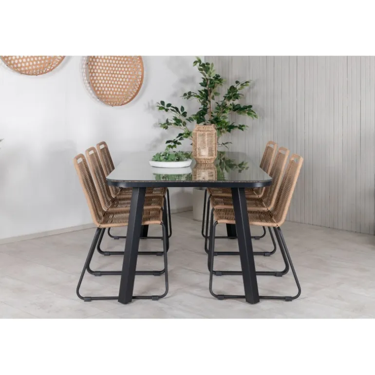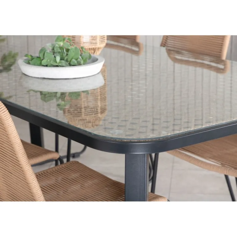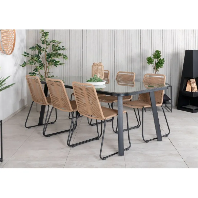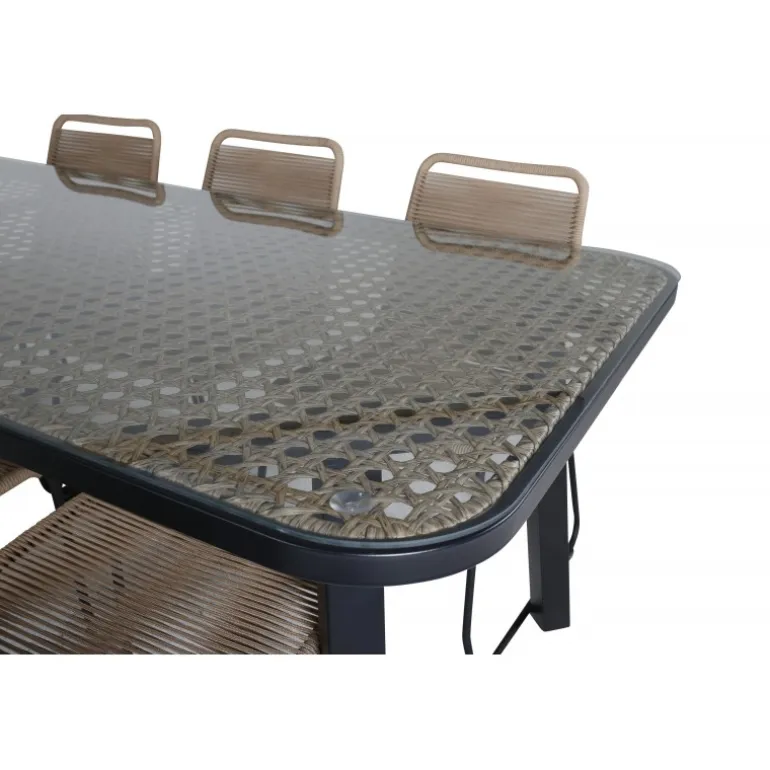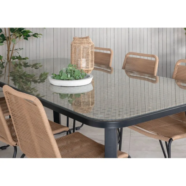 Oplev det ultimative i moderne og stilfuldt design med Paola Rektangulær Loungesæt – Havemøbelsæt. Dette sæt, der består af det elegante Paola-spisebord og Lindos-spiseborde, er den perfekte kombination til din have. Med materialer som glas, polyesterreb, stål og flet, er dette sæt både holdbart og visuelt tiltalende. Nyd dine udendørs måltider med stil og komfort. Husk at beskytte stålet mod rust ved at følge vores plejeanvisninger.