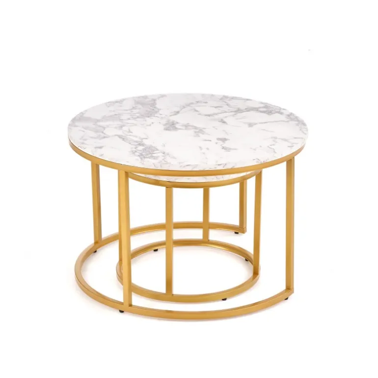 PAOLA sæt af 2 sofaborde kombinerer stil og funktionalitet for at forbedre din stue. Med dimensioner på 60/40 cm og 38/34 cm er disse borde ideelle til både små og store rum. Fremstillet af lamineret MDF og pulverlakeret stål, sikrer de holdbarhed og elegance. Den sofistikerede marmor/guld farvekombination tilføjer et luksuriøst touch til enhver indretning. Tilføj en moderne og praktisk løsning til dit hjem med PAOLA sofaborde.