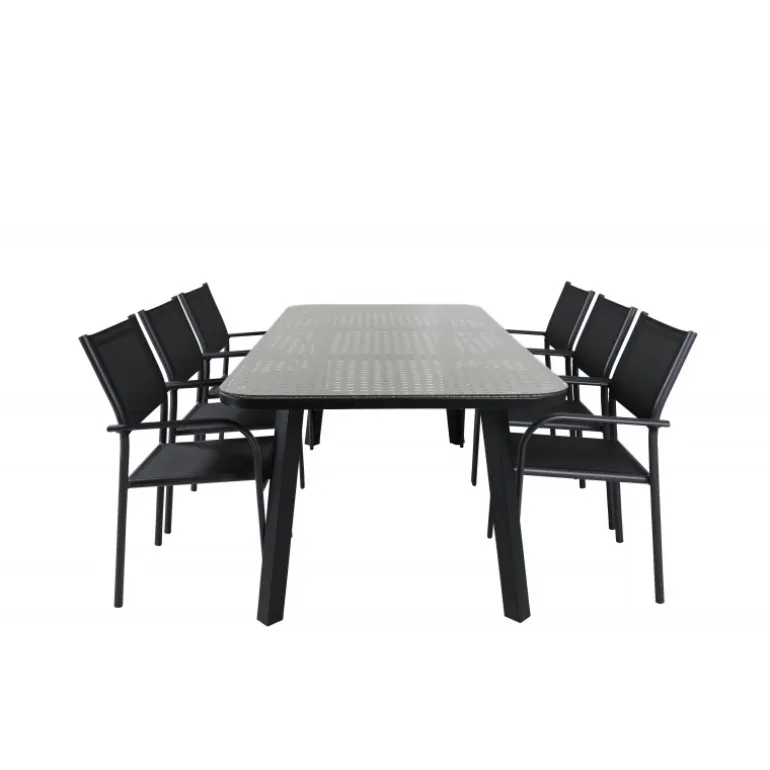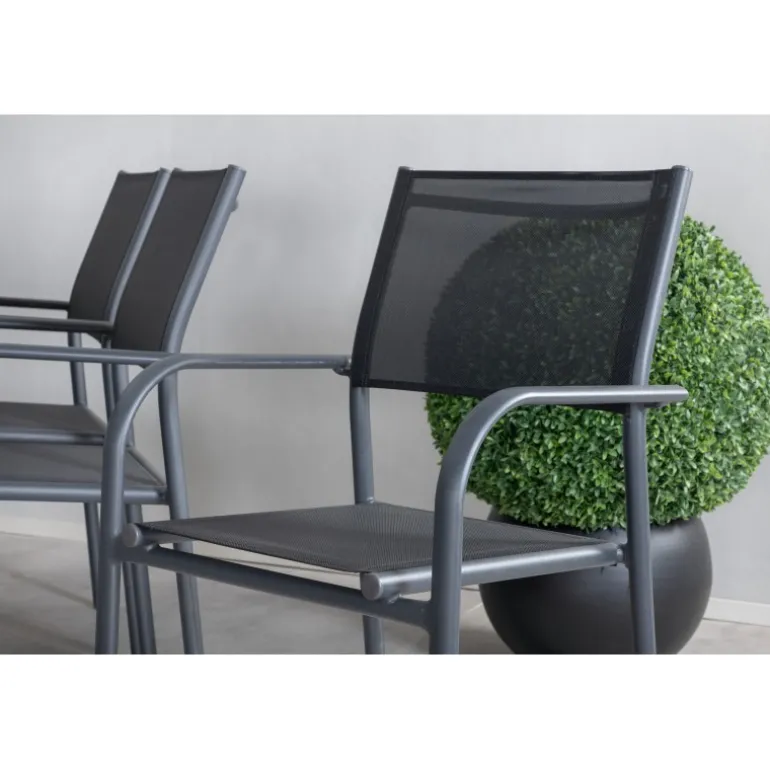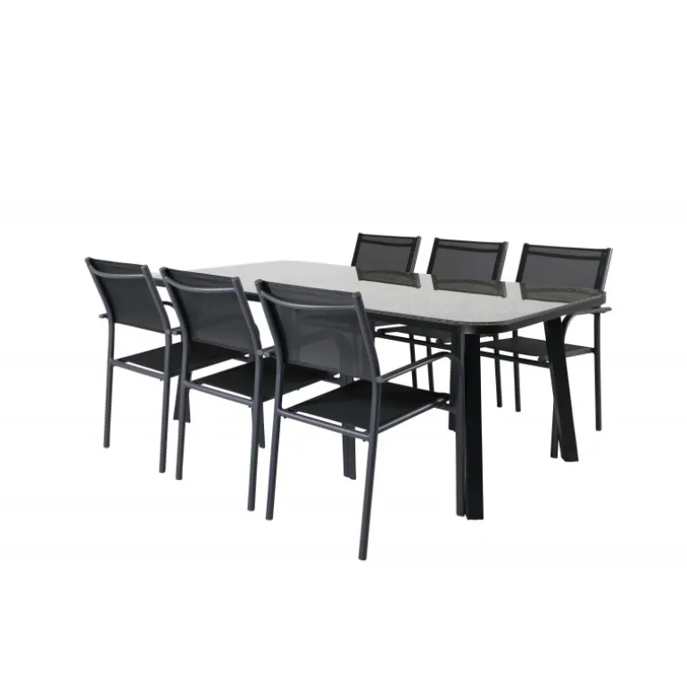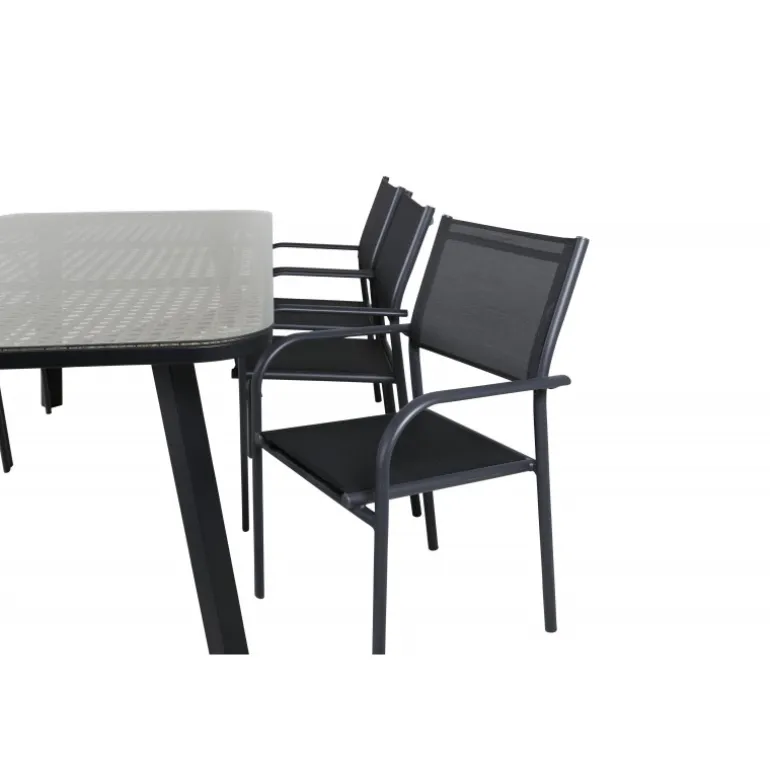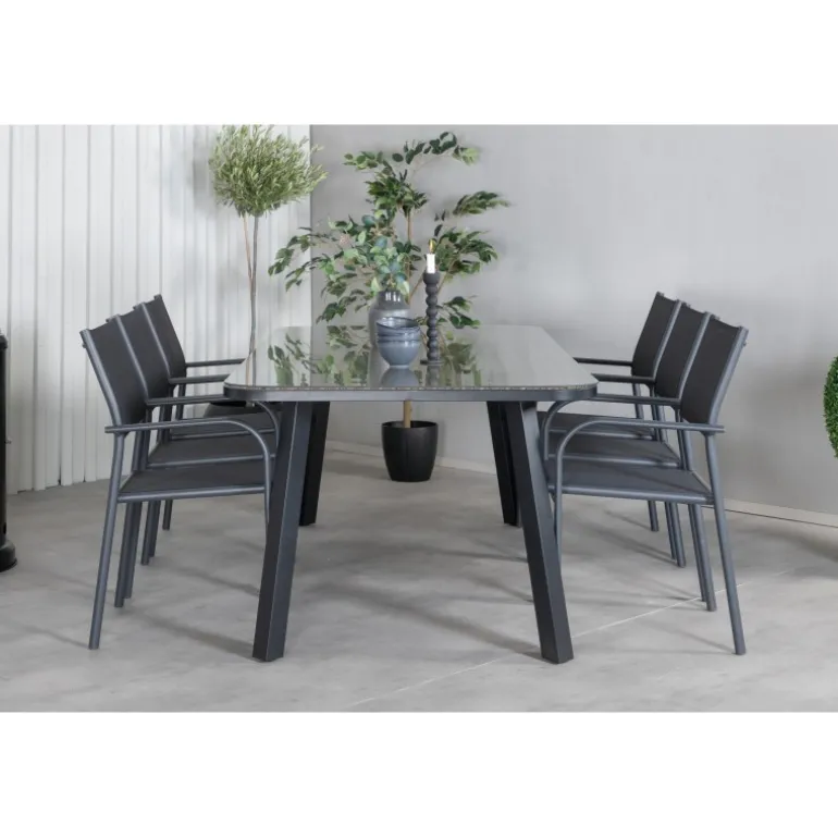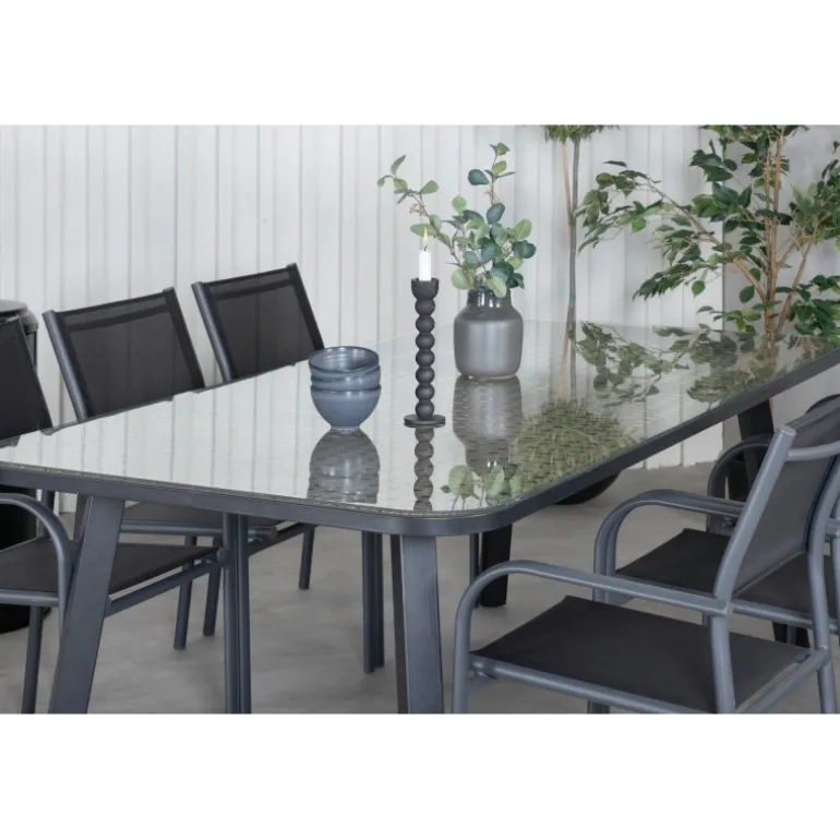 Spisebordet Paola i et slankt design, sammen med spisebordsstolene Santorini – den perfekte kombination for dem, der ønsker en trendy Loungesæt – Havemøbelsæt. De høje siddekomfort i stolene inviterer til lange og vidunderlige øjeblikke af socialt samvær!