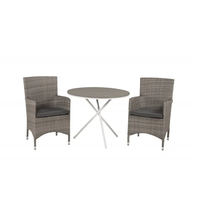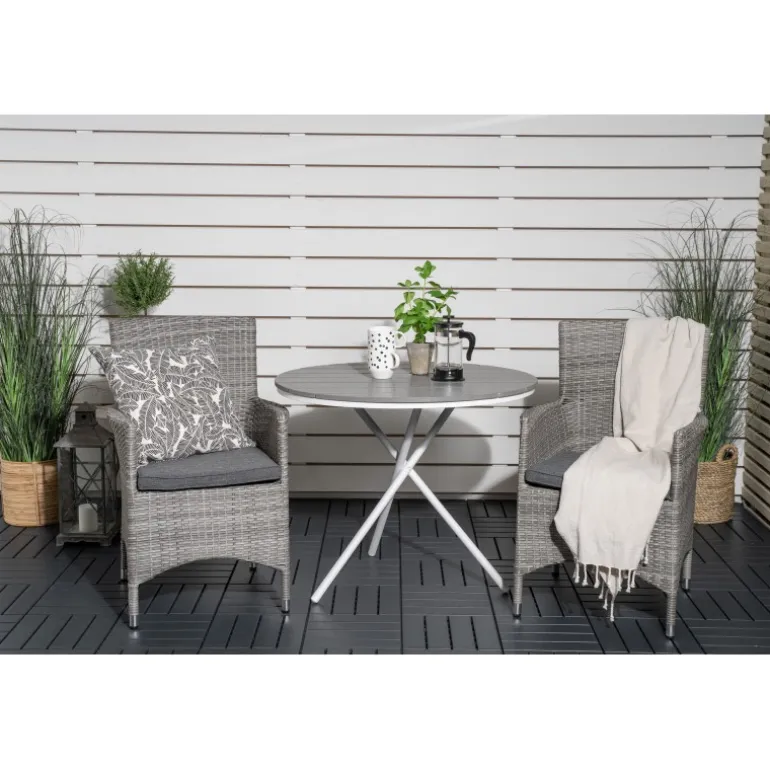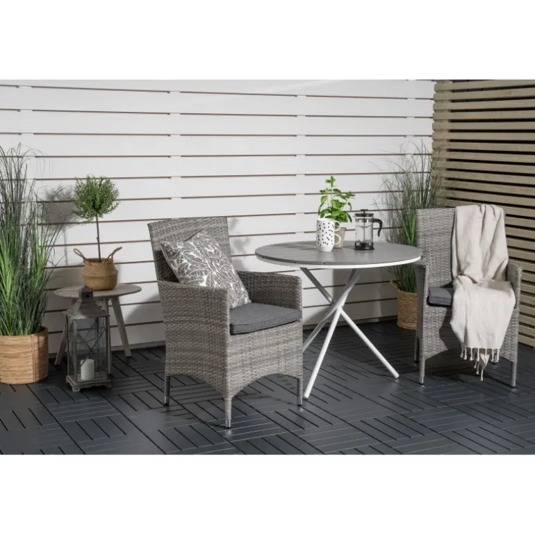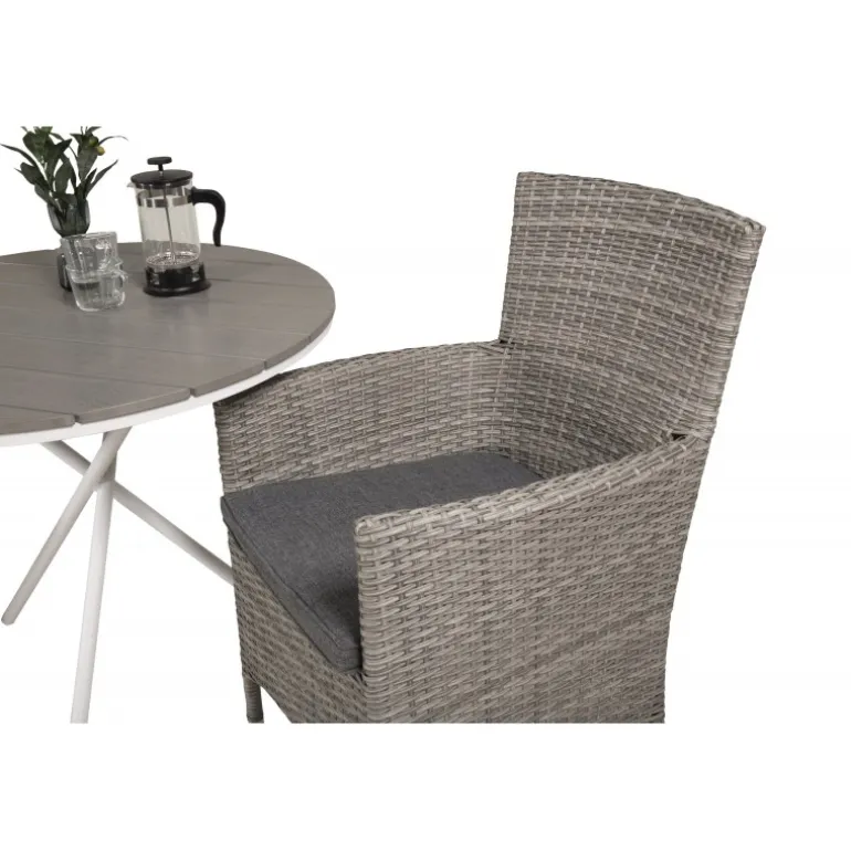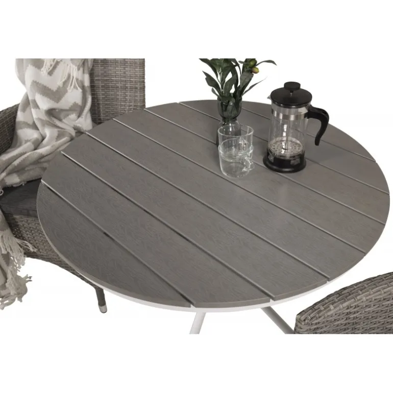 Forkæl dig selv med en hyggelig eftermiddagskaffe ved dette stilfulde og komfortable Loungesæt – Havemøbelsæt! Vores elegante runde spisebord Parma er perfekt til den solrige plads på altanen. Her kombineres det med robuste og komfortable spisebordsstole fra Malin-serien. Aintwood-materialet, der anvendes i bordpladen, er både holdbart og let at vedligeholde, hvilket gør det ideelt til udendørs brug.