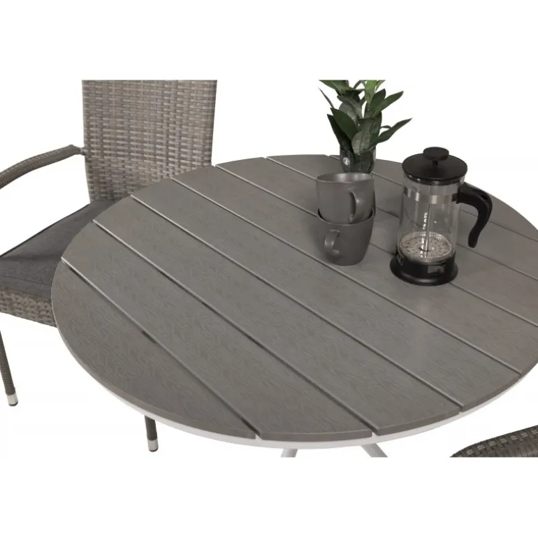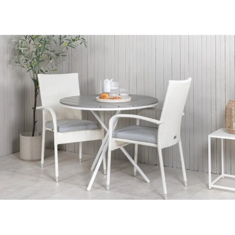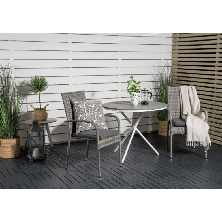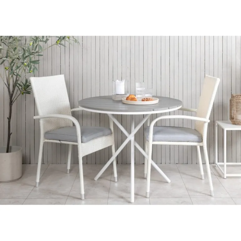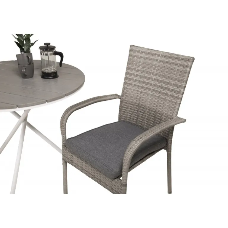 Parma Rund Loungesæt – Havemøbelsæt er den perfekte løsning til din balkon. Dette elegante sæt består af et Cafébord Parma og vores stablebare grå Anna stole. Skab den ideelle udendørs atmosfære og gør dig klar til sæsonen med stil!