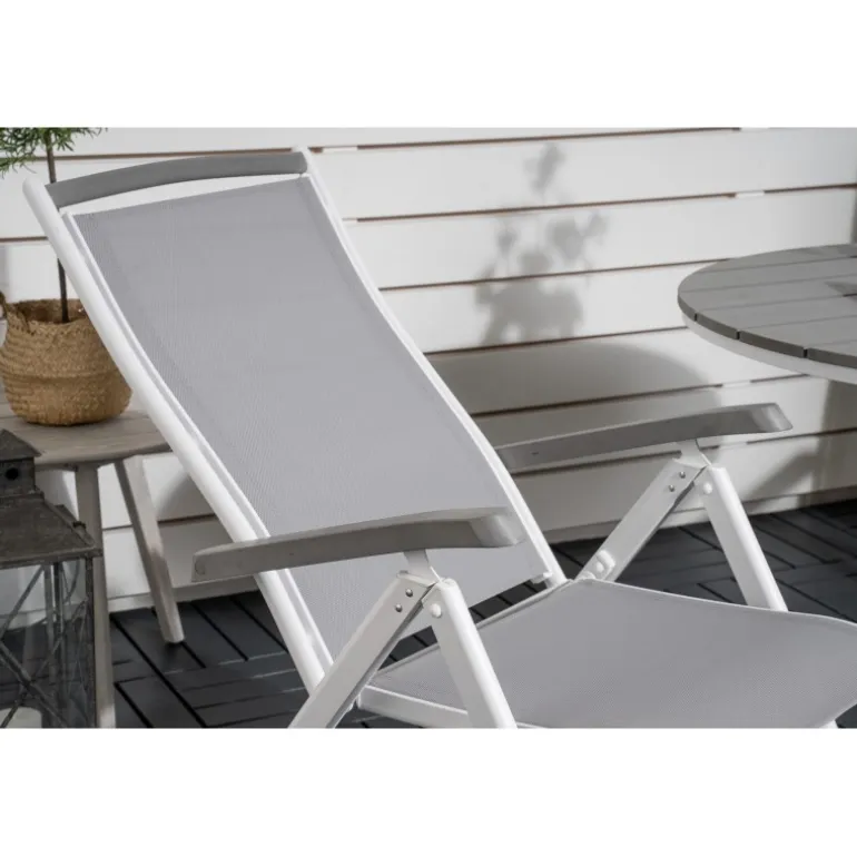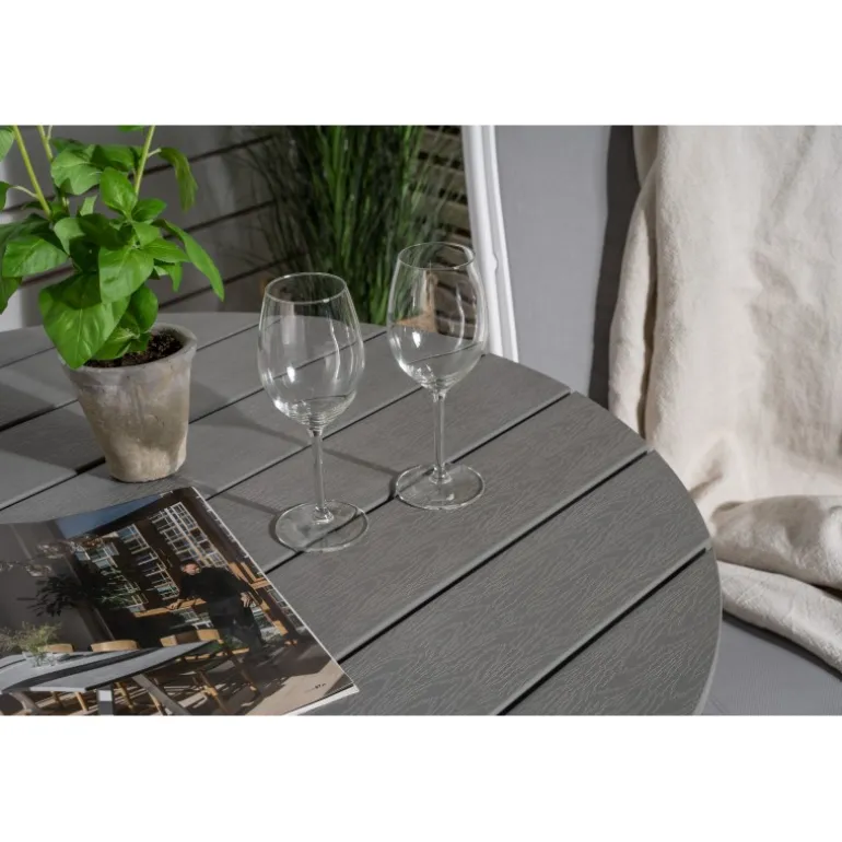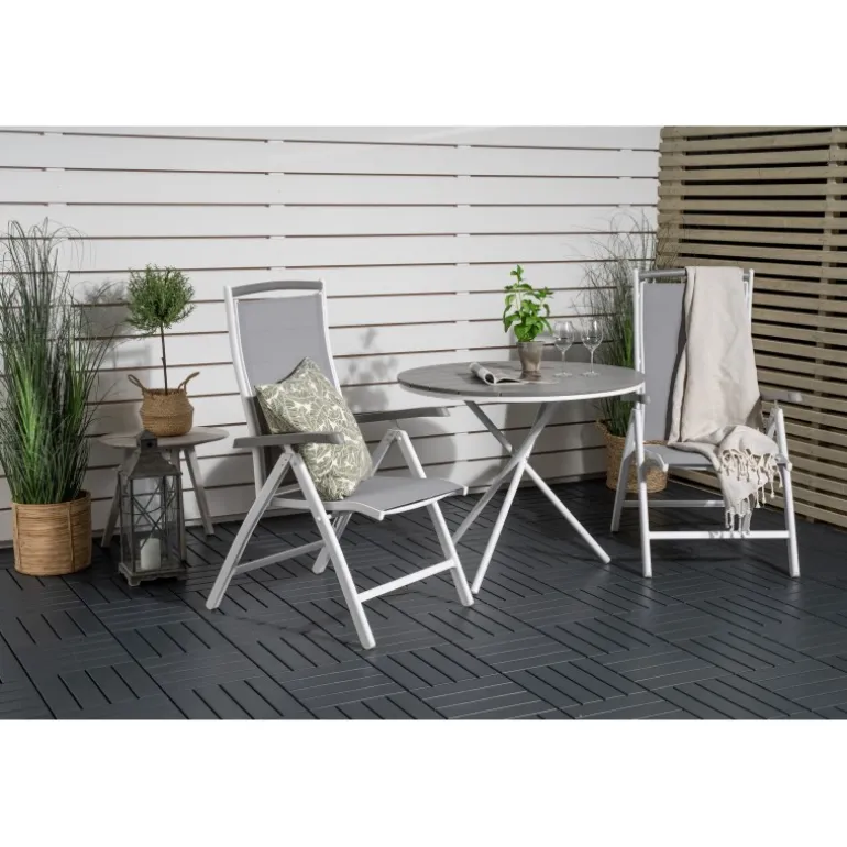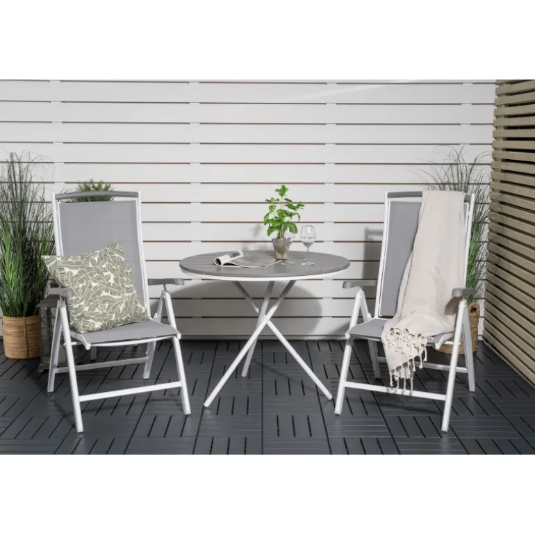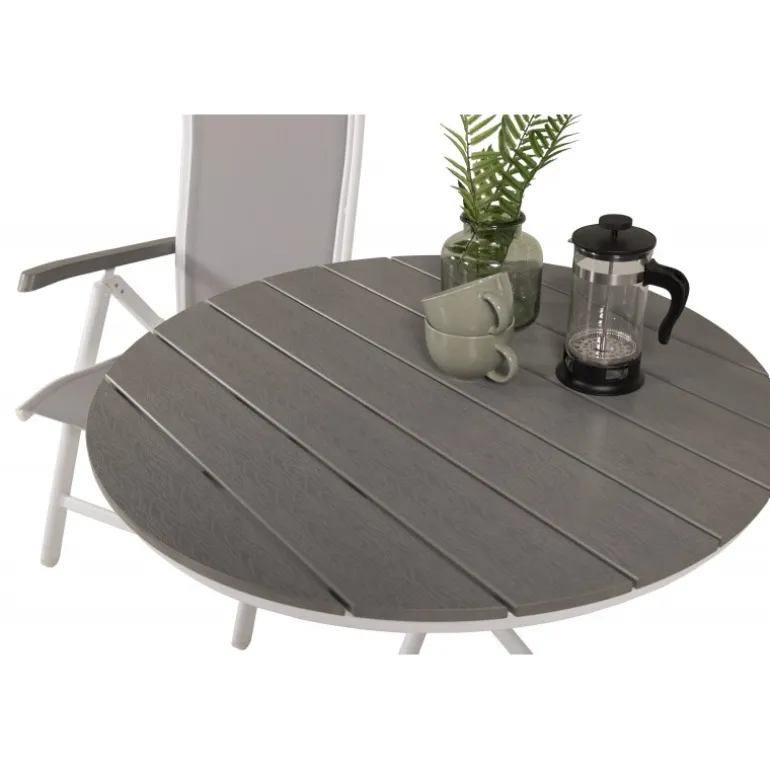 Parma Rund Loungesæt – Havemøbelsæt er en enkel og stilren løsning til din udendørs spiseplads. Med et bord fra Parma-kollektionen og stole fra Albany-serien, passer dette sæt nemt ind i de fleste miljøer og skaber en følelse af enkelhed. Bordet har en hvid bordplade lavet af aintwood, mens stolene er lavet af tekstilene og aluminium, hvilket sikrer både holdbarhed og komfort. Perfekt til hyggelige stunder med venner og familie i haven eller på terrassen.