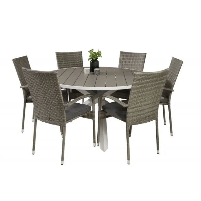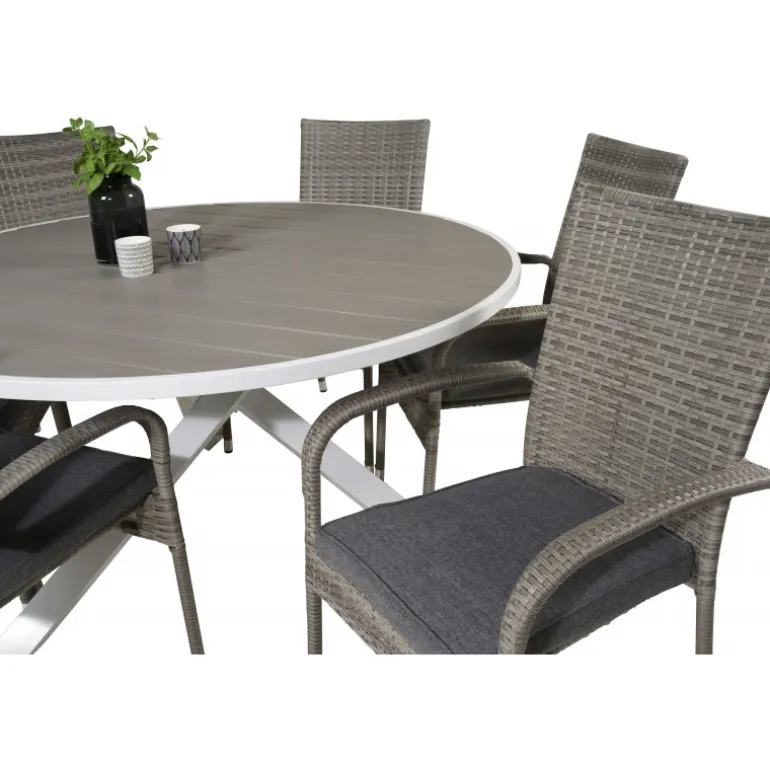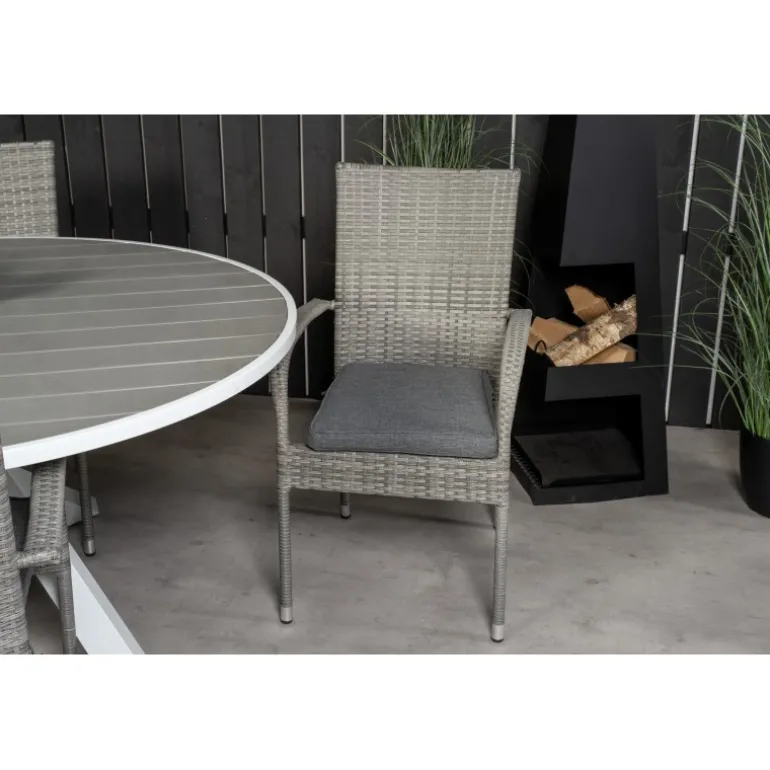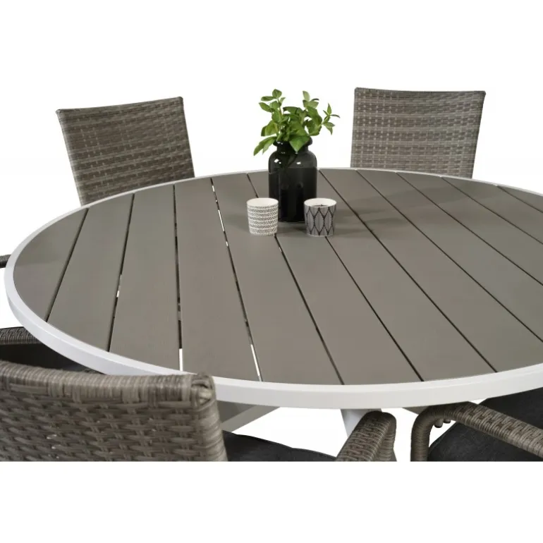 Rundt Loungesæt – Havemøbelsæt bestående af Parma spisebord og Anna stole. Her får du et Loungesæt – Havemøbelsæt i kunstig rattan, som passer ind i de fleste miljøer. Dette sæt er perfekt til udendørs brug og tilføjer et stilfuldt touch til din terrasse eller have. Bordpladen er fremstillet af aintwood, et plastmateriale, der er holdbart og nemt at vedligeholde, mens stellet er lavet af aluminium og stål, som sikrer stabilitet og lang levetid. Vær opmærksom på, at møbler i aintwood ikke bør placeres i uventilerede, glaserede områder, hvor temperaturen kan stige til høje grader, da dette kan deformere materialet.