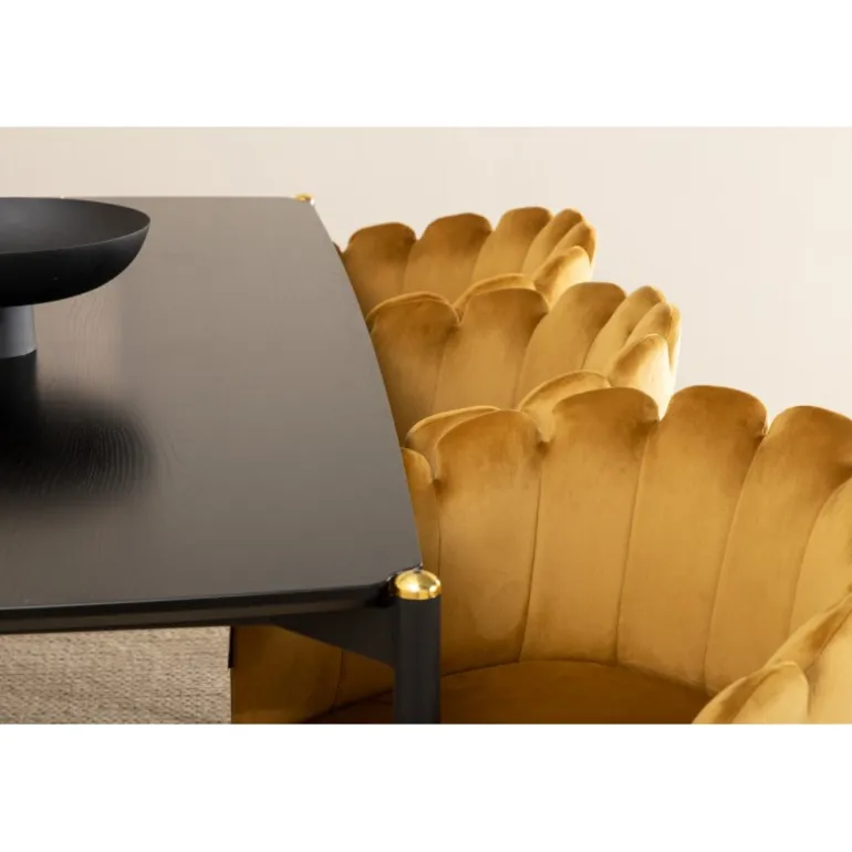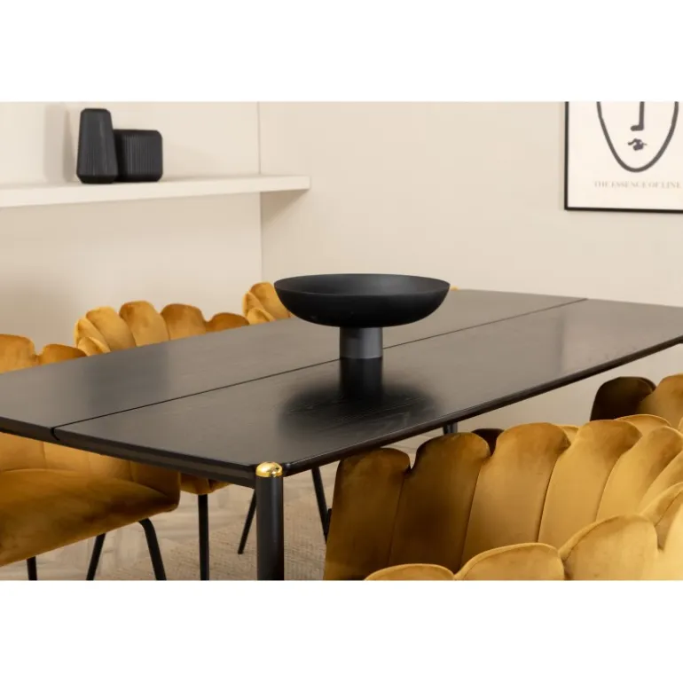 En moderne farveklat kan nemt løfte interiøret til næste niveau! Limhamn spisestol er en moderne favorit i mange husholdninger med sine bløde former og orm-formede ryg, lavet af gul velourstof og sorte stoleben i pulverlakeret metal. Stolene har et indbydende design med dekorative orm-formede ryg med dekorative sømme og et rundt sæde i gul velourstof. Stoldimensioner: Højde: 76,56 cm, sædehøjde: 48 cm, bredde: 61 cm, dybde: 54 cm. Her matches de 6 stole med et stilfuldt spisebord fra Pelle-serien. Bordpladen er i sort MDF med finer og bordbenene er i sort jern med en dekorativ messingknap på toppen. Borddimensioner: Længde: 190 cm, bredde: 90 cm, højde: 75 cm.