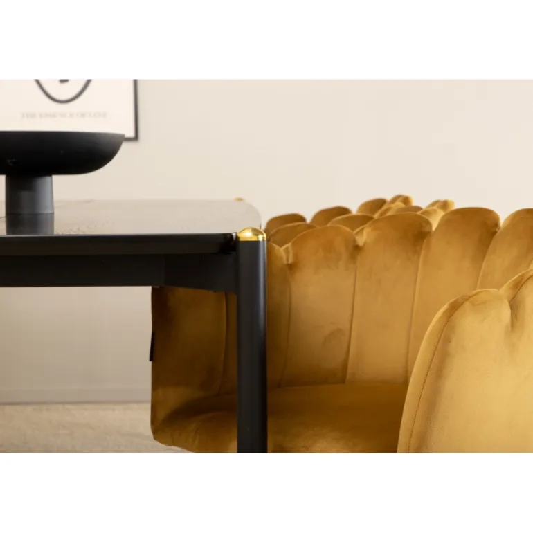 - Høj Kvalitet: Stole i gul velourstof og bord i sort MDF med finer.