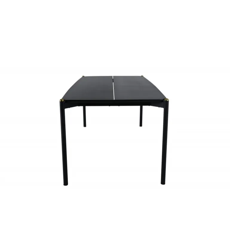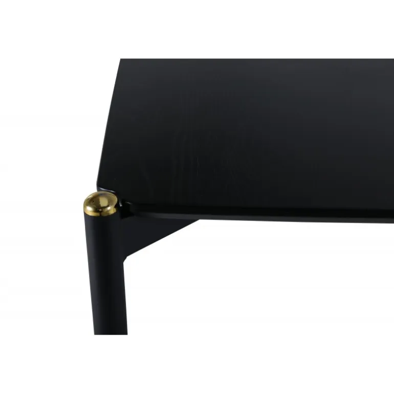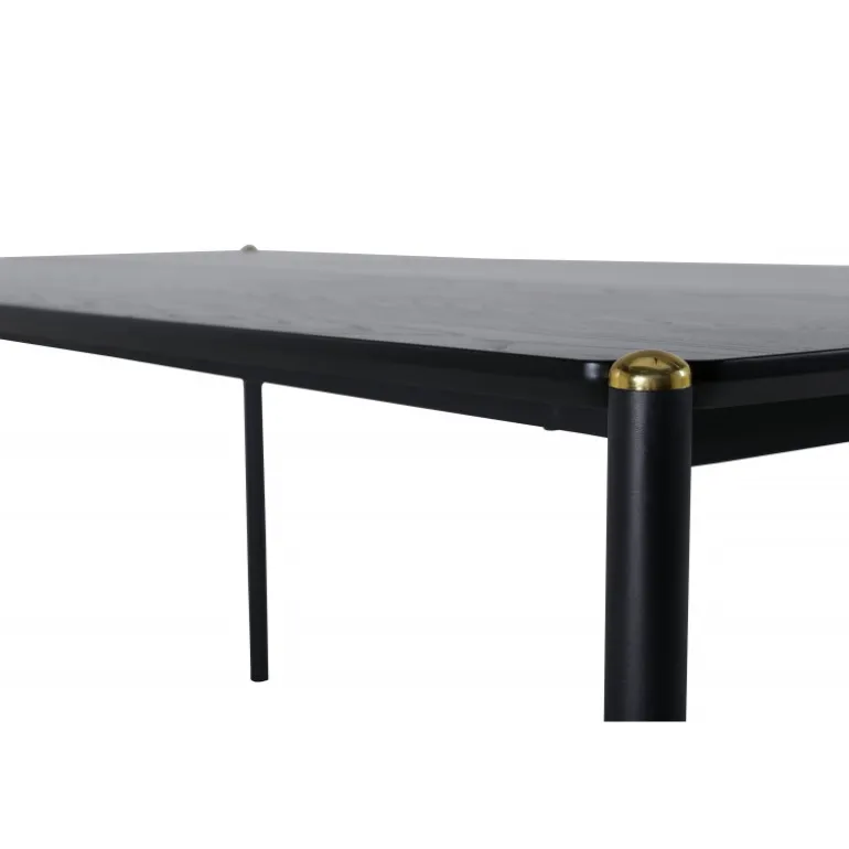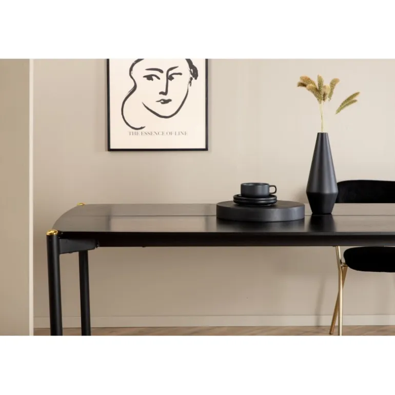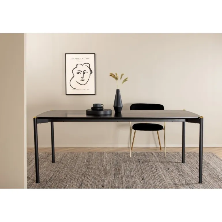 Stilfuldt, luksuriøst og tidløst – spisebordet Pelle skaber et modebevidst indtryk i dit hjem! Designet er velovervejet med lige nordiske former, der giver en elegant følelse, smalle ben i jern med en dekorativ messingknop på toppen og en rille i midten af bordpladen, som bliver en lækker detalje. Den gennemgående sorte farve er nem at matche og holder over tid. Spisebordpladen er i MDF finer. Følg vores vedligeholdelsesråd for de bedste tips, og du vil få et holdbart og slankt spisebord til ugens måltider!