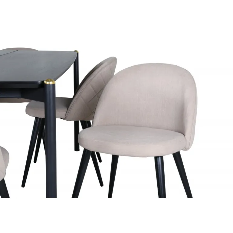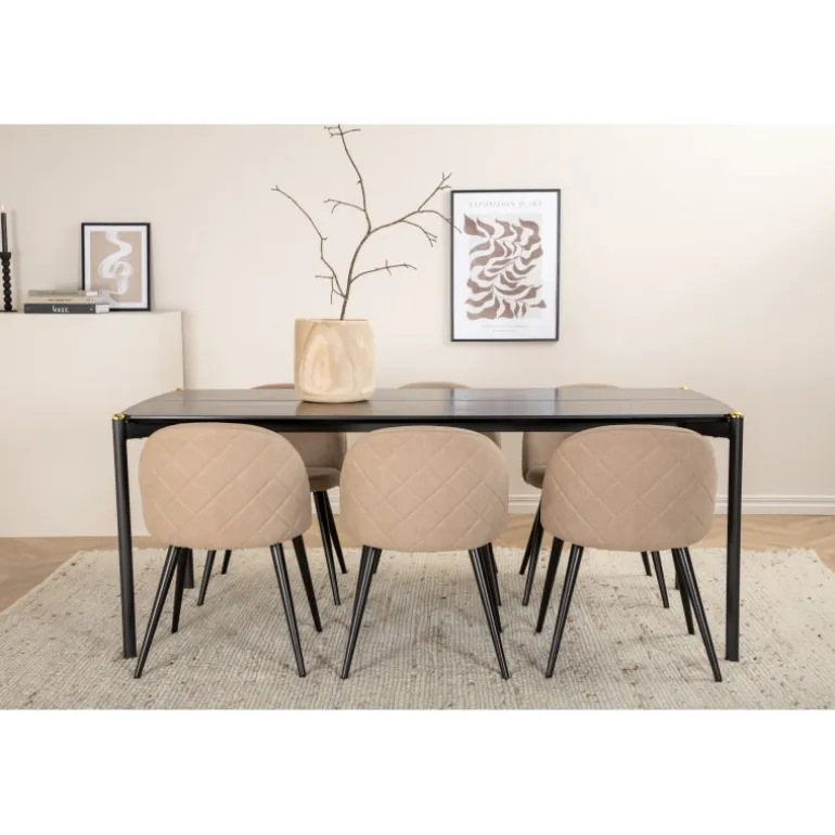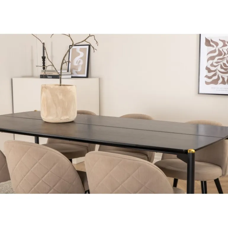 Stilfuldt, luksuriøst og tidløst – Spisebordssættet Pelle skaber et modebevidst indtryk i dit hjem! Designet er velovervejet med lige nordiske former, der giver en elegant følelse, smalle ben i jern med en dekorativ messingknop på toppen og en rille i midten af bordpladen, som bliver en lækker detalje. Bordpladen er i sort MDF med finer, og bordets dimensioner er: længde: 190 cm, bredde: 90 cm, højde: 75 cm. Her i en lækker kombination med 6 Velvet Stitches spisebordsstole. Stolebenene er let udvidede i sort jern, og sædet er beige i blødt polyester linned med dekorative syninger på stolens ryg. Stolens dimensioner: højde: 76,5 cm, sædehøjde: 46,5 cm, bredde: 50 cm, dybde: 57 cm.