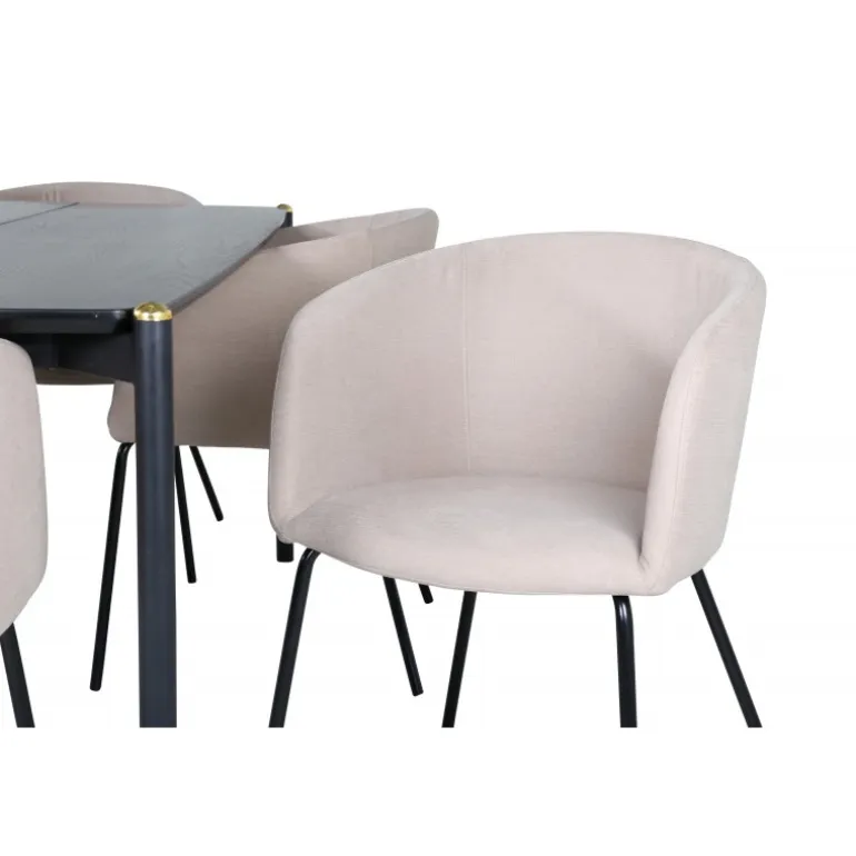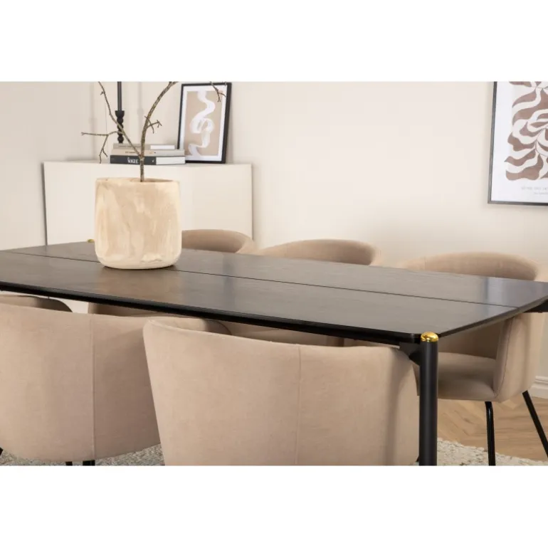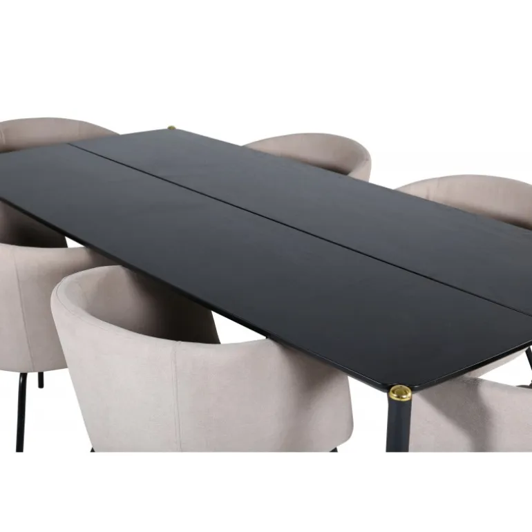 Lad dette smukke spisebordssæt med et moderne udtryk blive et naturligt samlingspunkt i dit hjem. Spisebordet Pelle har et gennemtænkt design med lige nordiske former, der giver et stilfuldt udtryk. De smalle ben i jern har en dekorativ messingknop på toppen og en rille i midten af bordpladen, som bliver en lækker detalje. Bordpladen er i sort MDF med finer, og bordets mål er: længde: 190cm, bredde: 90cm, højde: 75cm. Matchet her med 6 af vores populære spisebordsstole Berit. Stolene har et luksuriøst design med en komfortabel sæde i beige polyester linned og stilfuldt smalle ben i sort jern. Stolens dimensioner: Højde: 78cm, sædehøjde: 49cm, bredde: 55cm, dybde: 55cm.