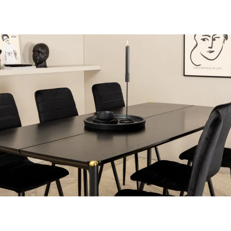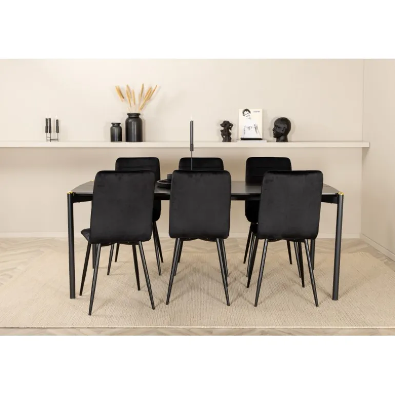 Oplev et moderne og stilfuldt Spisebordssæt med Pelle Rektangulært Spisebordssæt. Dette sæt kombinerer eksklusivitet og komfort med Windu luksus spiseborde i sort fløjl og metal, der skaber et indbydende blikfang. Stolenes dimensioner er: Højde: 94 cm, Sædehøjde: 47 cm, Bredde: 43 cm, Dybde: 49 cm. De seks stole matches perfekt med Pelle spisebordet, der har en sort MDF bordplade med finer. Bordets dimensioner er: Længde: 190 cm, Bredde: 90 cm, Højde: 75 cm. Designet er velovervejet med lige nordiske former, smalle ben i jern med dekorative messingknopper og en rille i midten af bordpladen, der giver en lækker detalje.