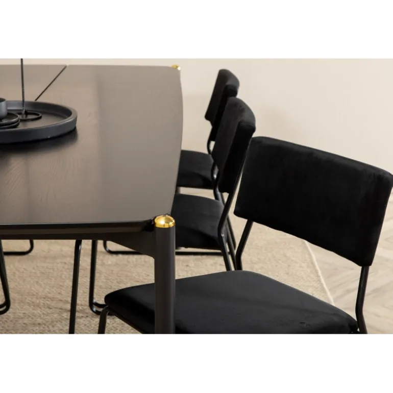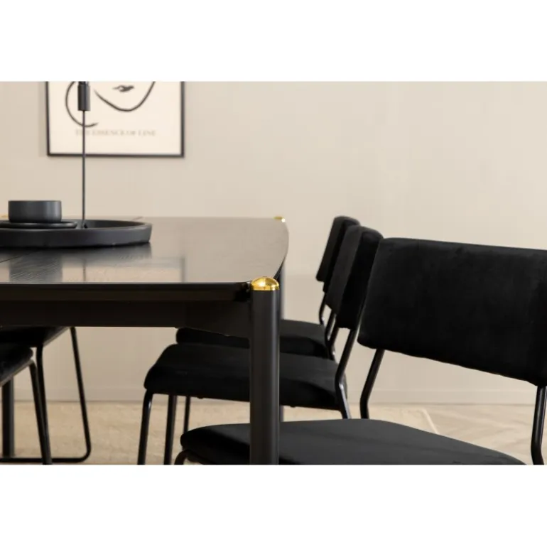 Inviterende, stilfuld og tidløs – spisebordet Pelle skaber et modebevidst indtryk i dit hjem! Designet er gennemtænkt med lige nordiske former, der giver en elegant følelse, slanke ben i jern med dekorative messingknopper på toppen og en smuk detalje i midten af bordpladen. Bordpladen er i sort MDF med finer og bordets dimensioner er: længde: 190 cm, bredde: 90 cm, højde: 75 cm. Matcher her med 6 Kenth spisebordsstole i sort farve med jernben og sæder af blødt velourstof. Stole Dimensioner: Højde: 76 cm, sædehøjde: 48,5 cm, bredde: 40 cm, dybde: 52 cm.