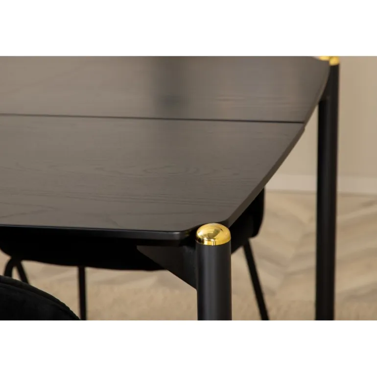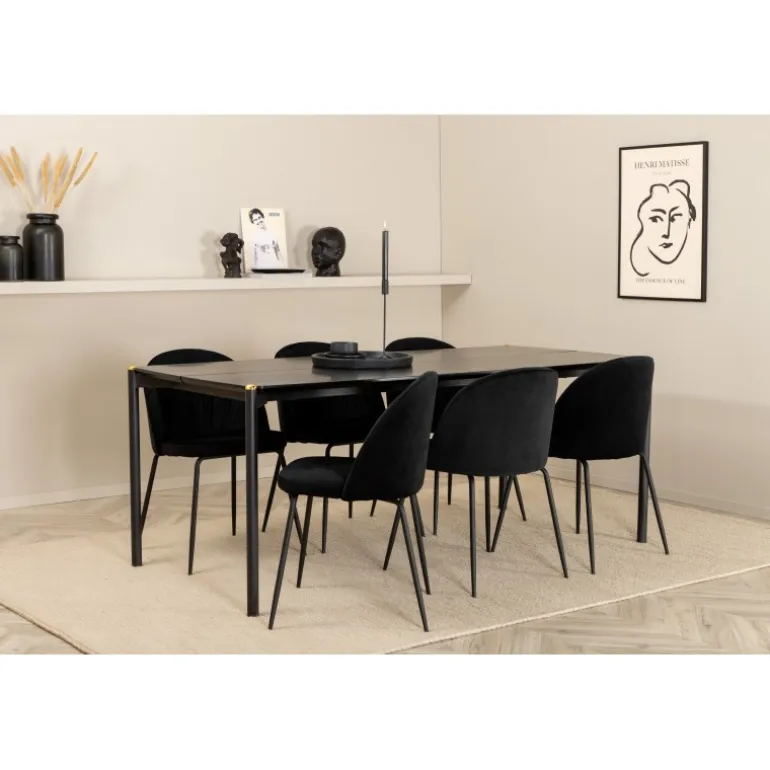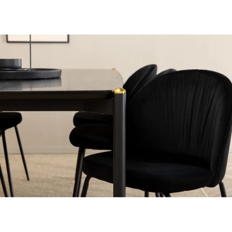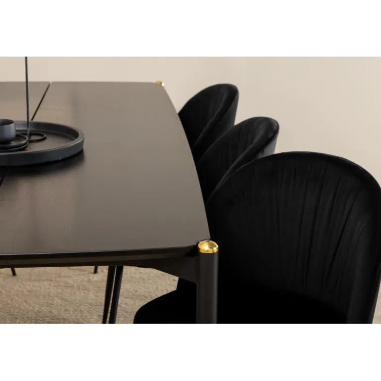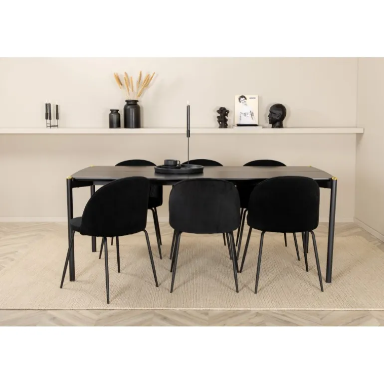 Et moderne Spisebordssæt med et eksklusivt design – Pelle Rektangulært Spisebordssæt i sort fløjl og metal er den perfekte kombination af stil og komfort! Spisestol Wrinkles har et fuldt beklædt design, der skaber et indbydende blikfang. Stolens dimensioner: Højde: 79,5 cm, Sædehøjde: 49,5 cm, Bredde: 49 cm, Dybde: 50 cm. Dette sæt inkluderer 6 stole, som matcher med Pelle Spisebord. Bordpladen er i sort MDF med finer, og bordets dimensioner er: Længde: 190 cm, Bredde: 90 cm, Højde: 75 cm. Designet er gennemtænkt med lige nordiske former, smalle ben i jern med dekorativ messingknop på toppen og en lækker detalje i midten af bordpladen.