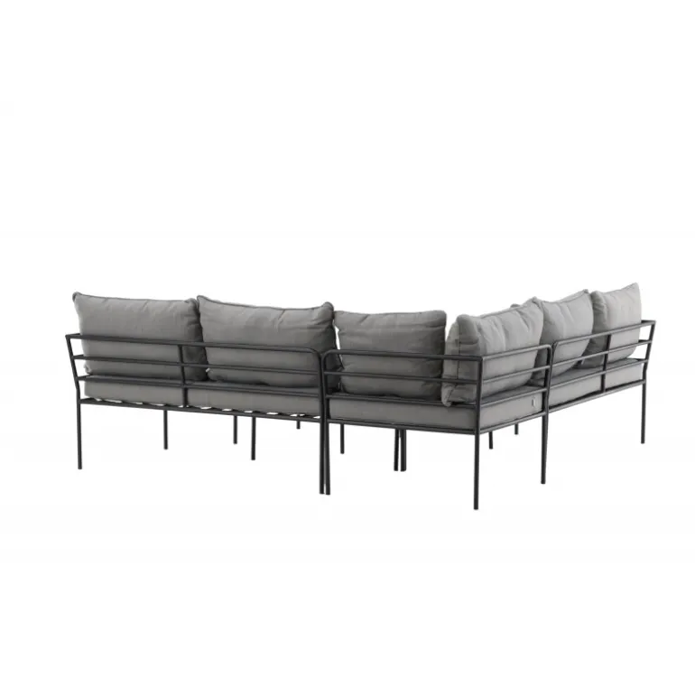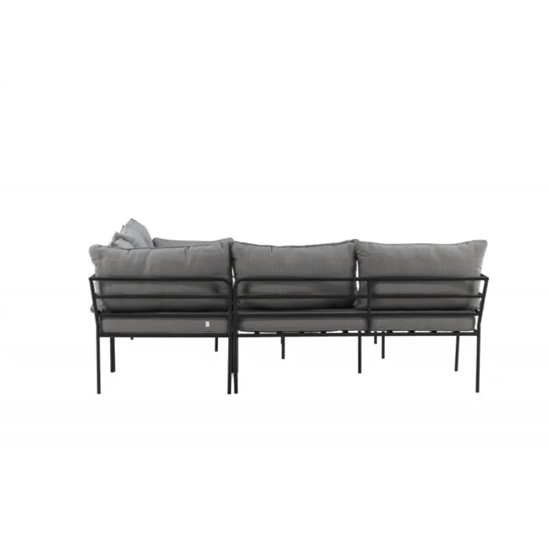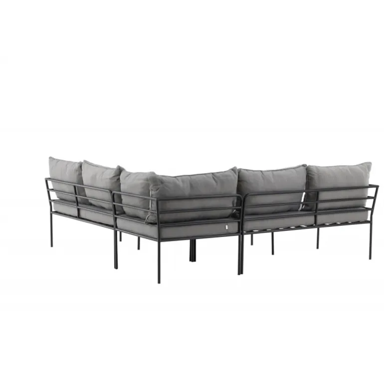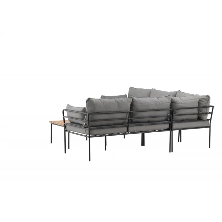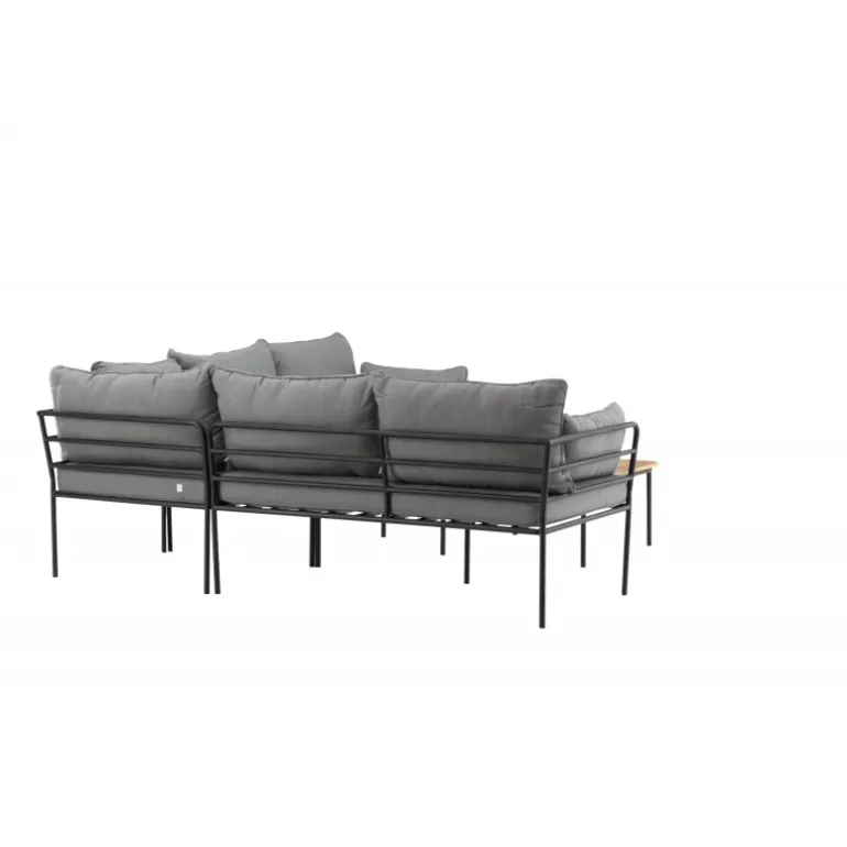 Den stilfulde og smukke Penh hjørnesofa sæt er perfekt til terrassen. Sofaen består af en hjørnesofa med fire sæder og en hjørneplads samt et elegant sofabord. Lavet af sort pulverlakeret metal med bløde, lysegrå puder. Sofabordet har tynde sorte ben, der skaber et elegant indtryk, og en bordplade i akacietræ med afrundede hjørner.