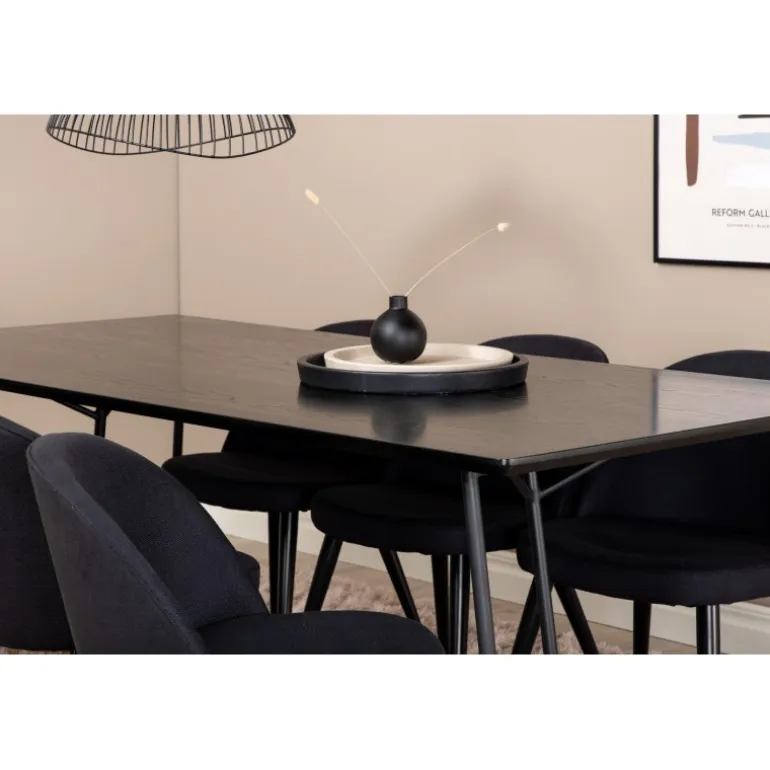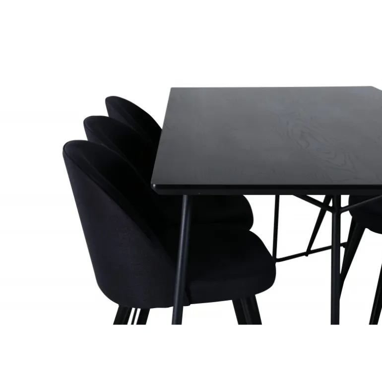 Hvad mere kan du ønske dig end en Spisebordssæt, der både er komfortabel, stilfuld og skaber en luksuriøs følelse i rummet? Det er præcis, hvad denne moderne kombination tilbyder! Spisebordet Petra har et velgennemtænkt design med skandinaviske former, der giver en elegant følelse, smalle, let udfladede ben i jern og en bordplade i sort MDF med finer. Bordmål: Længde: 190 cm, Bredde: 90 cm, Højde: 75 cm. Her sammen med 6 velour spisestole i blødt design med metalstoleben og sorte sæder i polyester. Stolmål: Højde: 76,5 cm, sædehøjde: 46,5 cm, bredde: 50 cm, dybde: 57 cm.