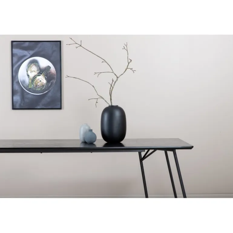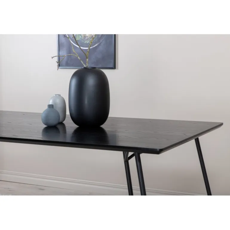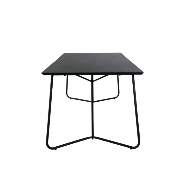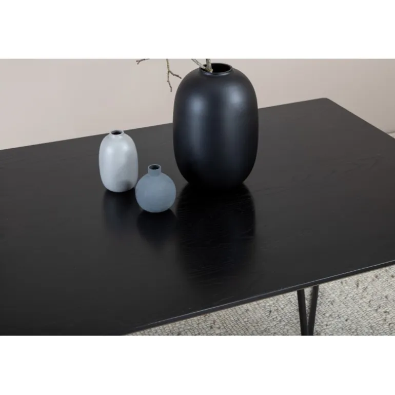 Petra er lige så praktisk som tidløs! Et gennemført sort spisebord med trekantede bordben i jern og en rektangulær bordplade i MDF. Det skandinavisk inspirerede design med smalle former og let udadgående ben giver en luksuriøs og stilfuld fornemmelse til din stue. Match med et par lækre spisebordsstole og nyd hyggelige måltider fremover! Plejeråd: MDF-plader, der er malede eller lakerede, er følsomme over for ridser og skader. Vær derfor forsigtig med pladerne for at undgå dette. Overflader malet med lak med farvepigment eller maling har en pigmentering, der giver en ikke-dækkende, transparent overflade.