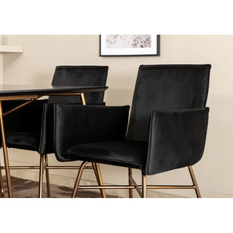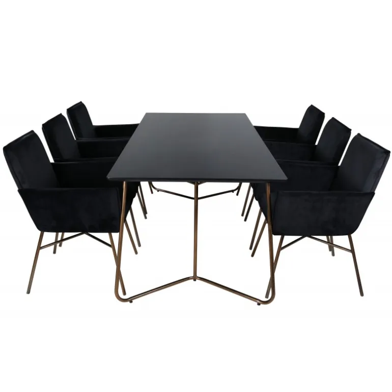 Petra rektangulær spisebordssæt passer perfekt og skaber en stilfuld atmosfære i din stue! Spisebordet Petra har et tidløst, skandinavisk design med en tynd bordplade i sort MDF med finer og bordben i kobberfarvet jern. Bordets dimensioner: Længde: 190 cm, Bredde: 90 cm, Højde: 75 cm. Sættet inkluderer 6 Petra spisebordsstole i elegant sort fløjlstof og kobberfarvede stoleben i jern. Stolens dimensioner: Højde: 87 cm, Sædehøjde: 48 cm, Bredde: 57 cm, Dybde: 60 cm. Synk ned i denne inviterende og stilfulde Spisebordssæt til lange middage med familie og venner!