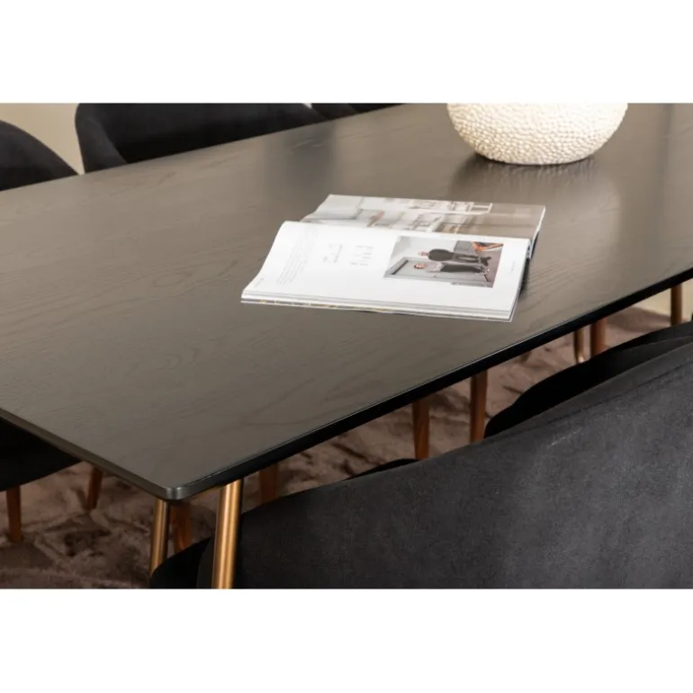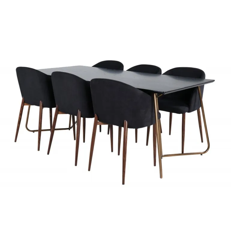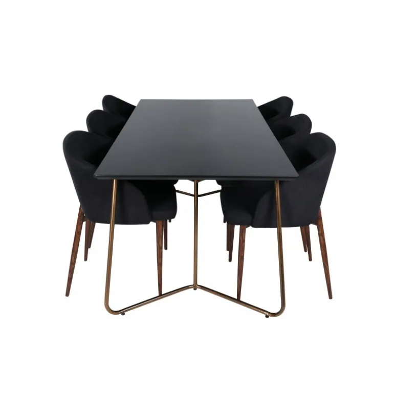 Lad denne smukt matchede Spisebordssæt med et moderne udtryk blive et naturligt samlingspunkt i dit hjem. Spisebordet Petra har et gennemtænkt design med skandinaviske former, der giver en stilfuld følelse. Bordet har smalle, let flarede ben i jern og en bordplade i sort MDF med finer. Bordmål: Længde: 190 cm, Bredde: 90 cm, Højde: 75 cm. Matchet her med 6 af vores lækre spisestole Arch med valnøddefarvede metalrammer og sorte sæder i polyester. Stolemål: Højde: 83 cm, sædehøjde: 53 cm, bredde: 48,5 cm, dybde: 55 cm. En Spisebordssæt med alt det rigtige, ganske enkelt!