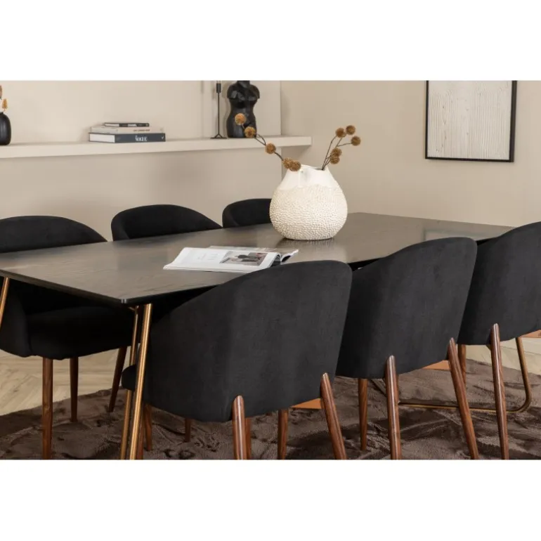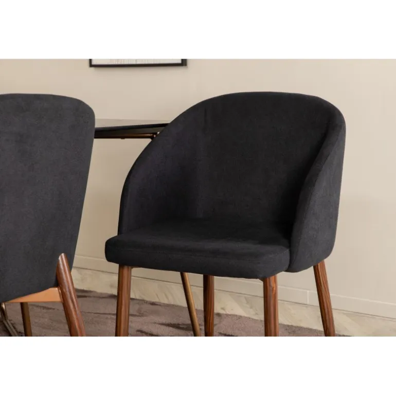 - Komplet sæt: Inkluderer 6 Arch spisestole med valnøddefarvet metalramme og sorte polyester sæder.