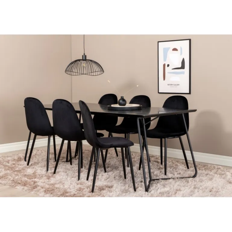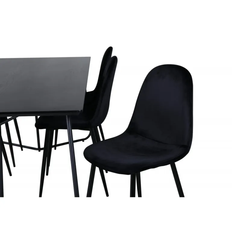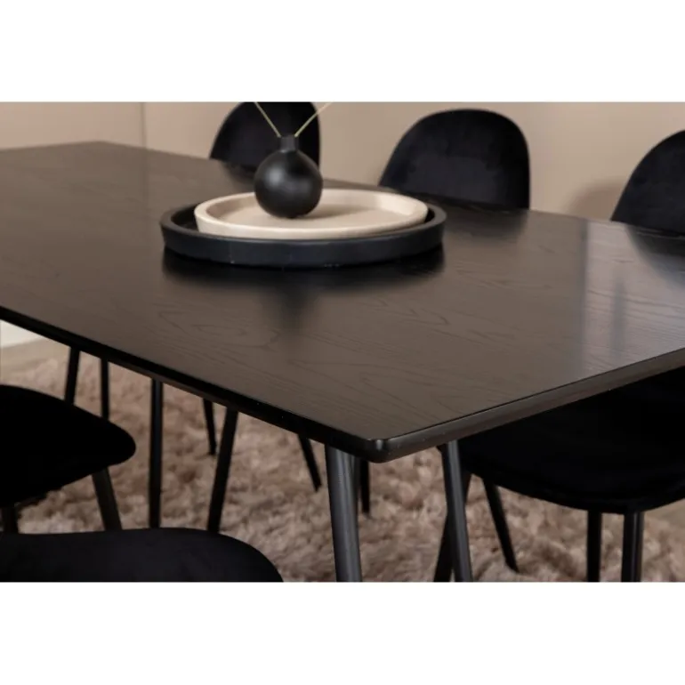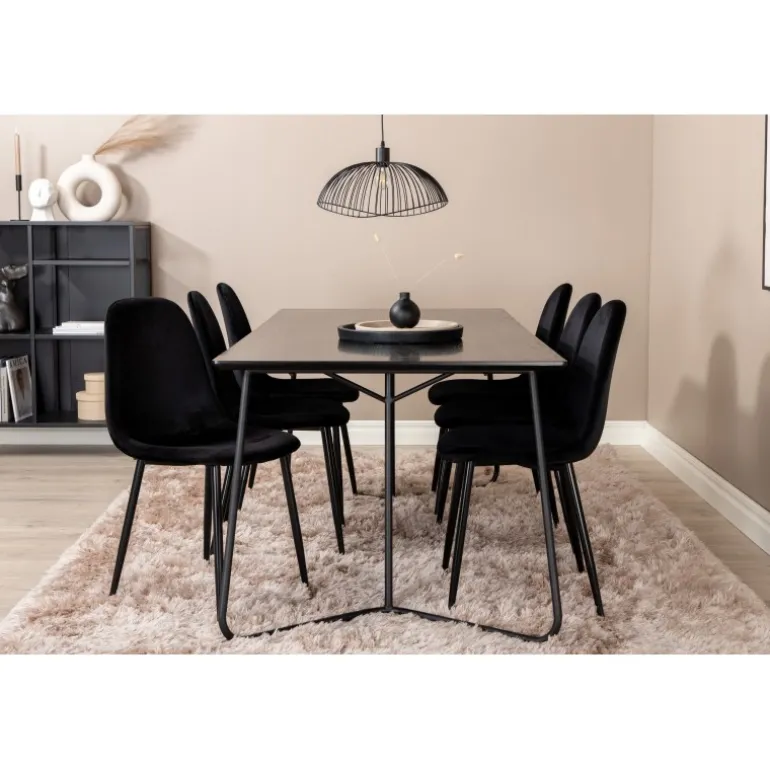 Oplev det delikate Petra Rektangulær Spisebordssæt i en elegant sort farve – stilfuldt, let og indbydende til alle måltider på dagen! Her kombineres spisebordet Petra med spisebordsstole fra Polar-serien. Bordet har et stilrent design med bordplade i sort MDF med finer og let udstillede bordben i jern. Bordmål: Længde: 190 cm, Bredde: 90 cm, Højde: 75 cm. De 6 spisebordsstole har smalle ben i metal og en blød, fuldt polstret sæde i velourstof. Stolens mål: Højde: 88 cm, sædehøjde: 41,5 cm, bredde: 42,5 cm, dybde: 53,3 cm. Lad dette smukt matchende Spisebordssæt med en moderne følelse blive et naturligt samlingssted i dit hjem.