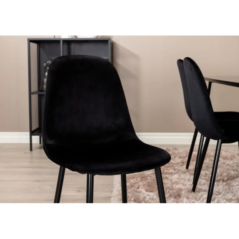 - Komfortable stole: Bløde, fuldt polstrede sæder i velourstof med smalle metalben.