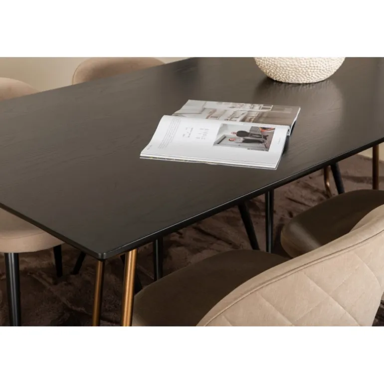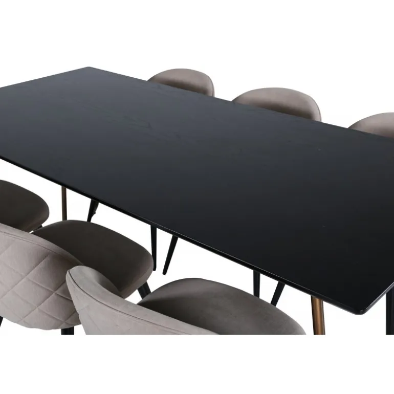 Hvad mere kan du ønske dig end et Spisebordssæt, der både er komfortabelt, stilfuldt og giver en luksuriøs følelse til rummet? Det er præcis, hvad denne moderne kombination tilbyder! Spisebordet Petra har et gennemtænkt design med skandinaviske former, der giver et stilfuldt udseende, smalle, let udadvendte ben i jern og en bordplade i sort MDF med finer. Bordets dimensioner: Længde: 190 cm, Bredde: 90 cm, Højde: 75 cm. Her sammen med 6 Velvet spisebordsstole i blødt design med sorte metalstoleben og beige sæder i polyesterlin. Stolens dimensioner: Højde: 76,5 cm, sædehøjde: 46,5 cm, bredde: 50 cm, dybde: 57 cm.
