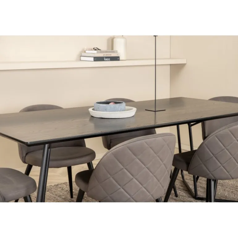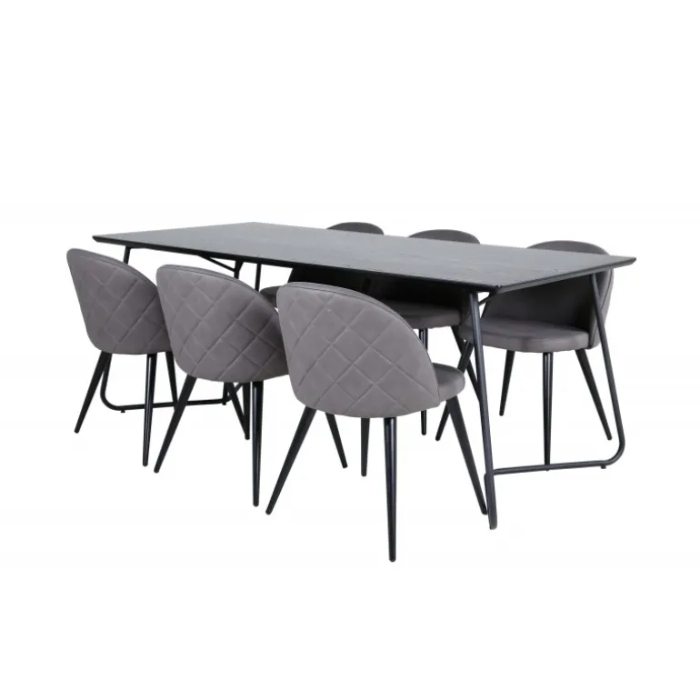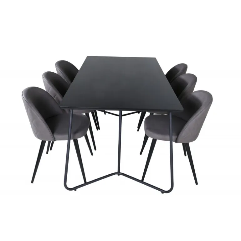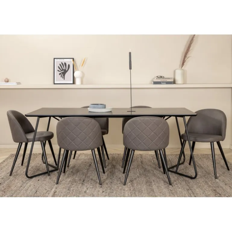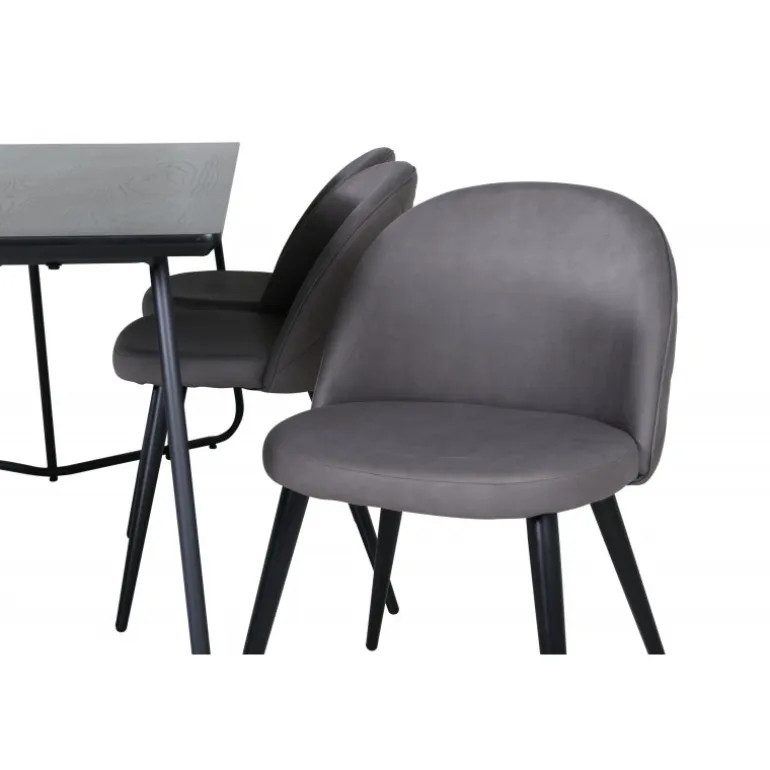 Hvad mere kan man ønske sig end en Spisebordssæt, der både er komfortabel, stilfuld og giver en luksuriøs følelse til rummet? Det er præcis, hvad denne moderne kombination tilbyder! Spisebordet Petra har et gennemtænkt design med skandinaviske former, der giver et stilfuldt udtryk, smalle, let udbuede ben i jern og en bordplade i sort MDF med finer. Bordets dimensioner: Længde: 190 cm, Bredde: 90 cm, Højde: 75 cm. Her sammen med 6 Velvet Stitches spisestole i blødt design med sort metalstolben og grå sæder i mikrofiber. Stolens dimensioner: Højde: 76,5 cm, sædehøjde: 46,5 cm, bredde: 50 cm, dybde: 57 cm.