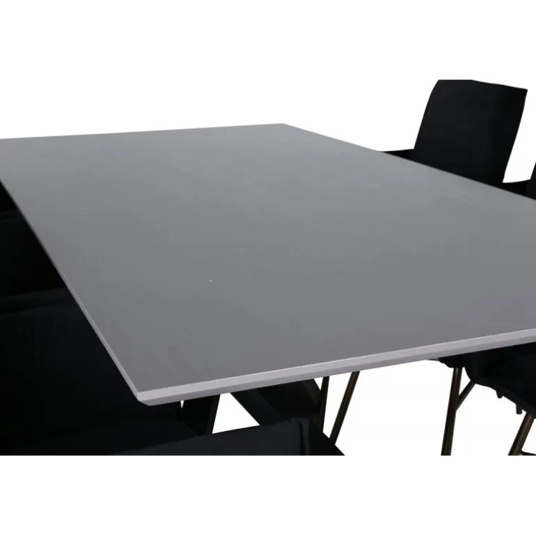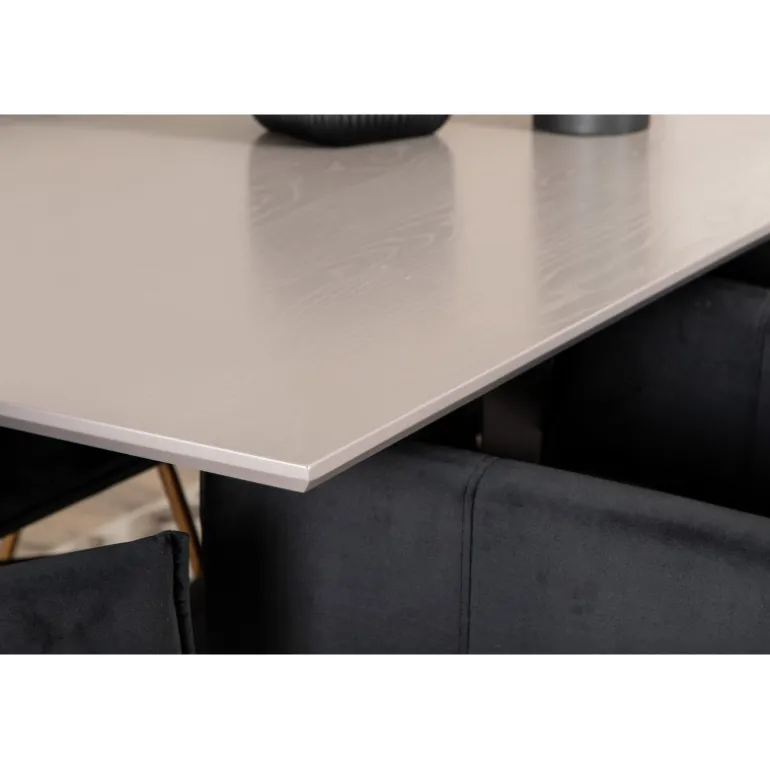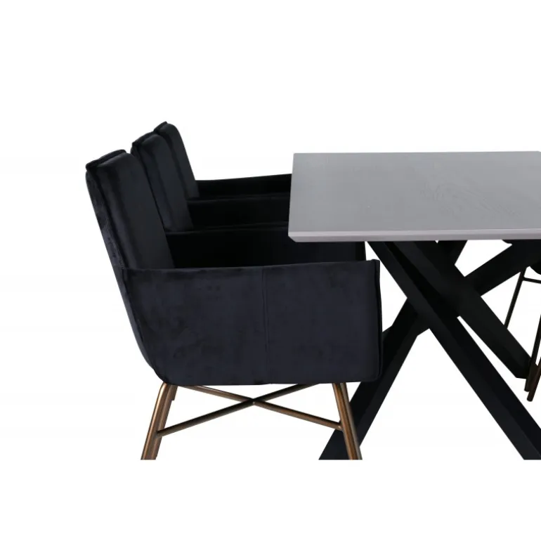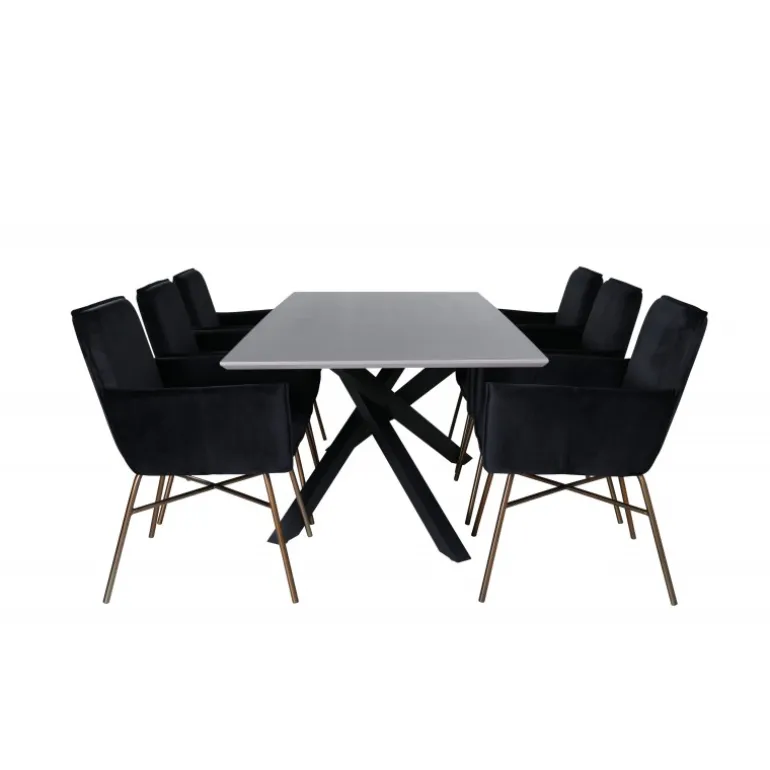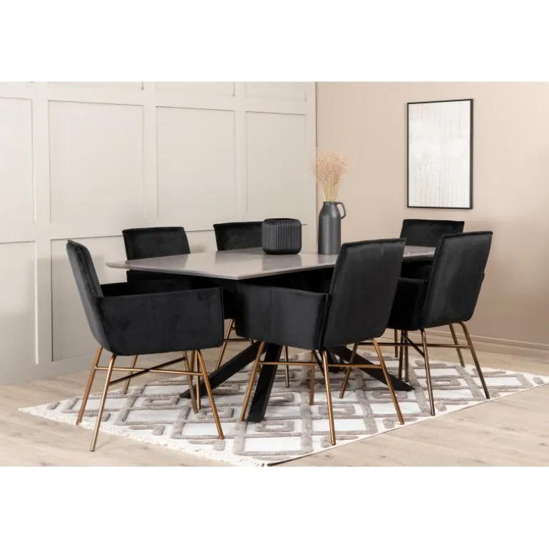 Petra spisebordsstole imponerer med deres luksuriøse design og høje komfort! Stolens ben er i kobberfarvet jern, og sædet er i elegant sort fløjl. Stolens dimensioner: Højde: 87 cm, sædehøjde: 48 cm, bredde: 57 cm, dybde: 60 cm. Vores 6 spisebordsstole er her matchet med Piazza, vores populære rektangulære spisebord med luksuriøs fornemmelse og trendy detaljer i designet. Bordpladen i grå farve er lavet af MDF. Stellet har et lækkert look med krydsben i sort jern, der skaber et stabilt blikfang. Bordets dimensioner: Længde: 190 cm, bredde: 90 cm, højde: 76 cm.