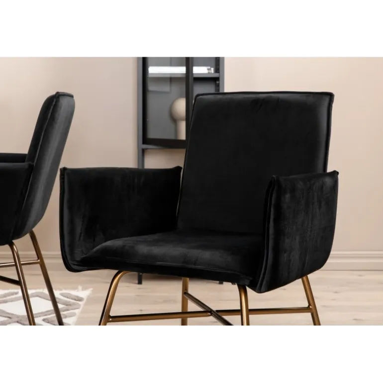 - Luksuriøst design: Petra stole i sort fløjl og kobberfarvet jernben.