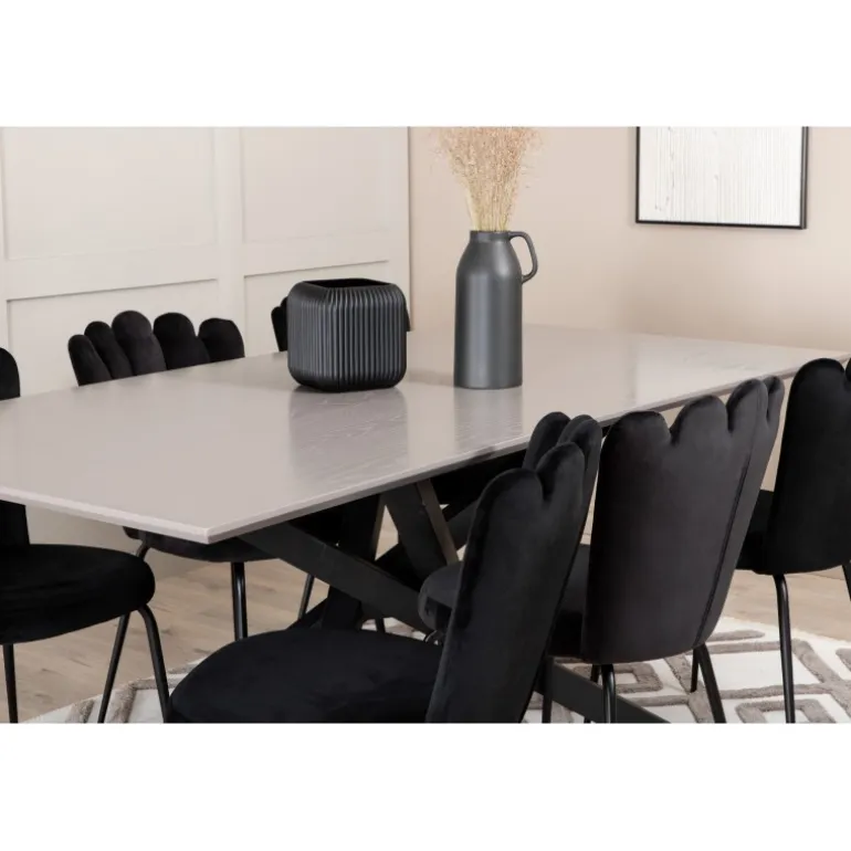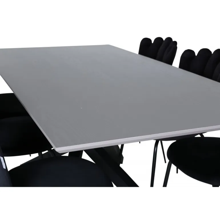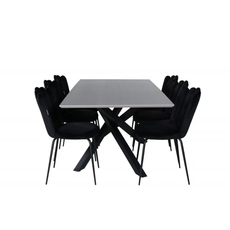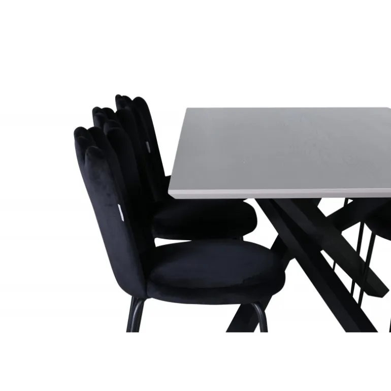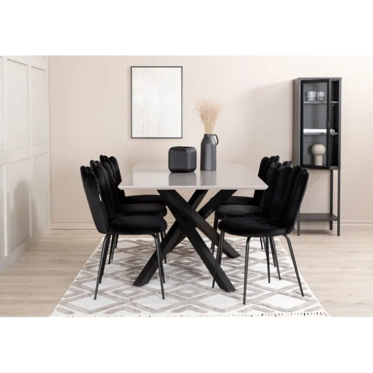 Limhamn spisebordsstol er en moderne favorit i mange husstande. Den har et indbydende design med dekorative ormformede ryglæn med dekorative sømme og en rund sæde i sort velourstof og stoleben i pulverlakeret metal. Stoldimensioner: Højde: 82,5 cm, sædehøjde: 48 cm, bredde: 44,5 cm, dybde: 54 cm. Her i perfekt kombination med vores rektangulære spisebord Piazza. Bordet har en tynd lysegrå bordplade lavet af MDF og en dekorativ ramme med krydsben i sort jern, der skaber et stabilt blikfang. Bordsdimensioner: Længde: 190 cm, Bredde: 90 cm, Højde: 76 cm.