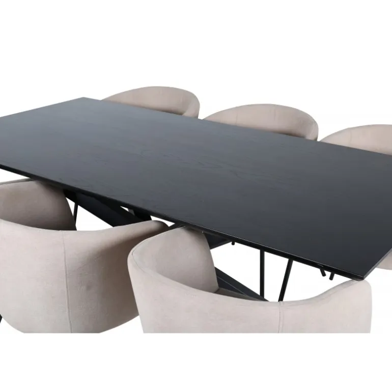 - Luksuriøst design: Elegant kombination af sort MDF-bordplade og beige stole i polyesterlinned.