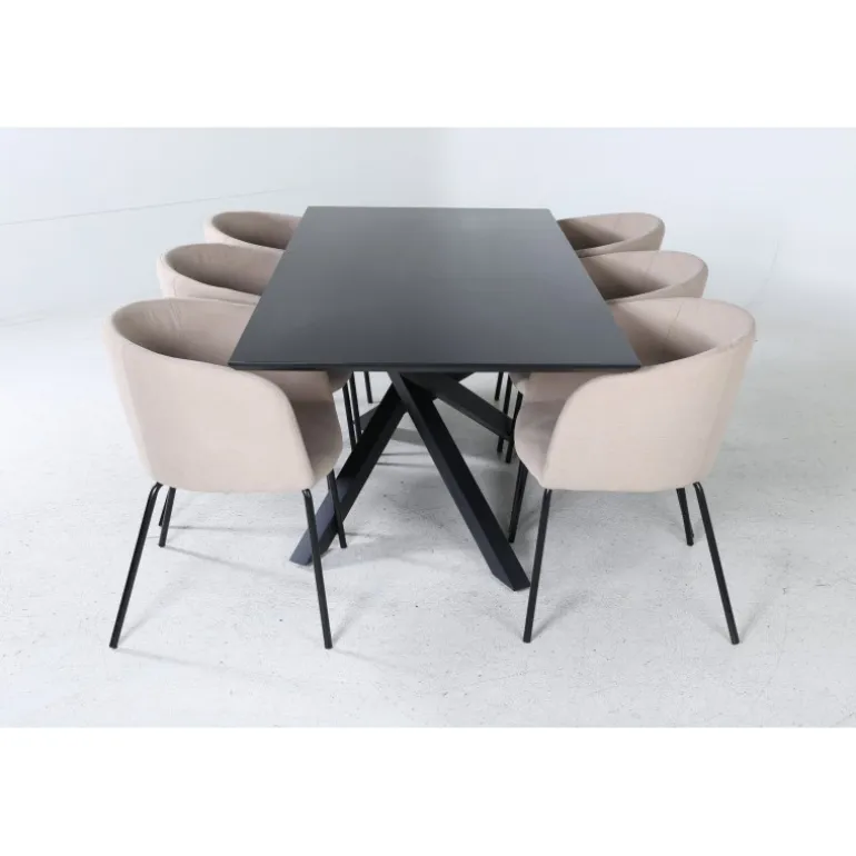 Piazza er vores populære rektangulære spisebord med en luksuriøs følelse og trendy detaljer i designet. Bordpladen er lavet af MDF-finér i en smuk sort farve, og stellet skaber et stabilt blikfang med krydsben i sort jern. Her i en vidunderlig kombination med vores elegante spisebordsstole fra Berit-serien. Stolen har et luksuriøst design i beige polyesterlinned, og stolens ben er stilfuldt smalle i sort jern. Indret indbydende og skab et stilfuldt look i dit hjem!