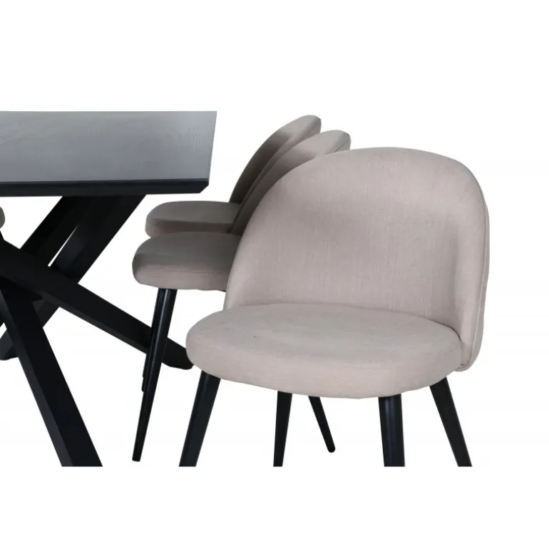 Skab en hjemlig atmosfære med et charmerende Spisebordssæt! Piazza er vores populære rektangulære spisebord med en luksuriøs følelse og trendy detaljer i designet. Bordpladen er lavet af MDF-finer i en smuk sort farve, og kroppen skaber en stabil blikfang med krydsben i sort jern. Her i lækker kombination med spisebordsstole fra Velvet Stitches-serien, der bidrager til en flot helhed i stuen. Stolebenene er let udfladede i sort jern, og de beige sæder er i polyesterlinned. Nyd hyggelige måltider!