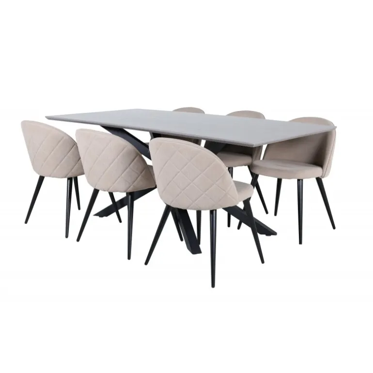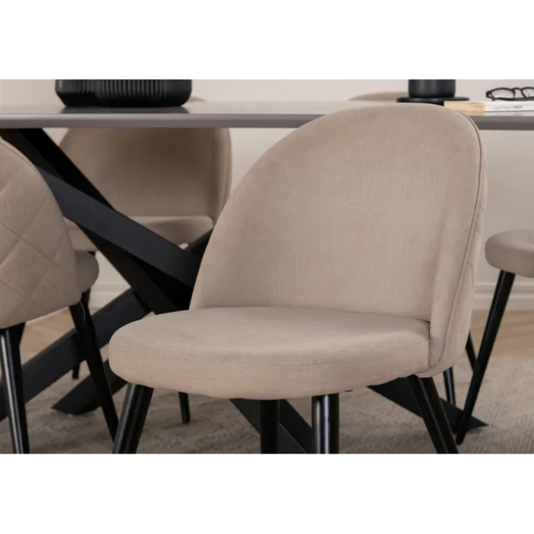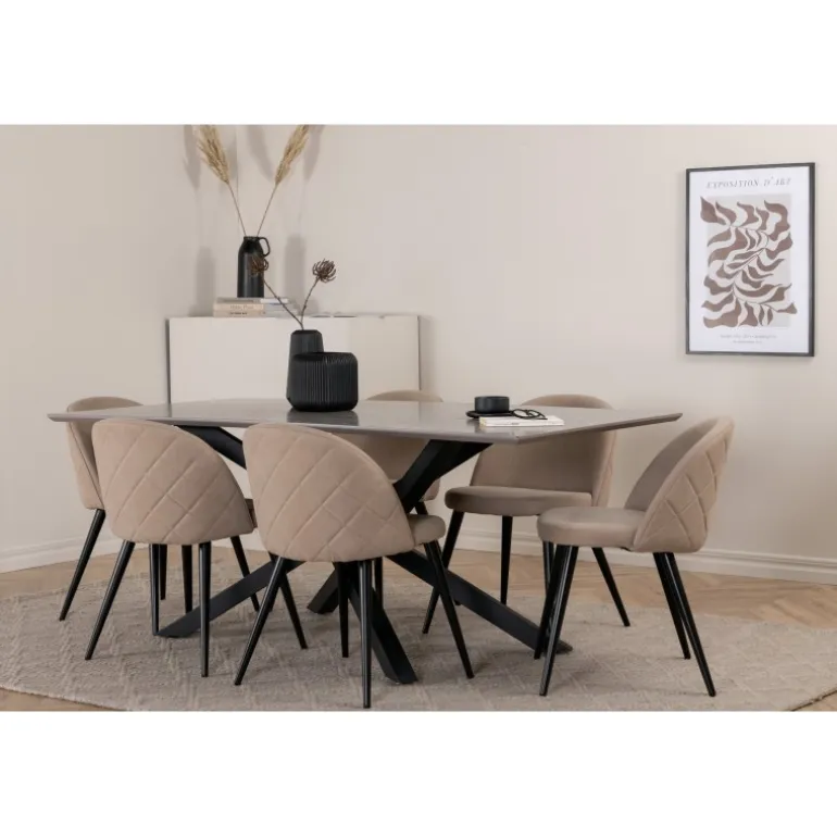 Skab en hjemlig atmosfære med et charmerende Spisebordssæt! Piazza er vores populære rektangulære spisebord med luksuriøs fornemmelse og trendy detaljer i designet. Bordpladen er lavet af MDF-finer i en smuk grå farve, og kroppen skaber en stabil blikfang med krydsben i sort jern. Her i dejlig kombination med spisestole fra Velvet Stitches-serien, som bidrager til en flot helhed i stuen. Stolebenene er let udfladede i sort jern, og de beige sæder er i polyester linned. Nyd behagelige måltider!