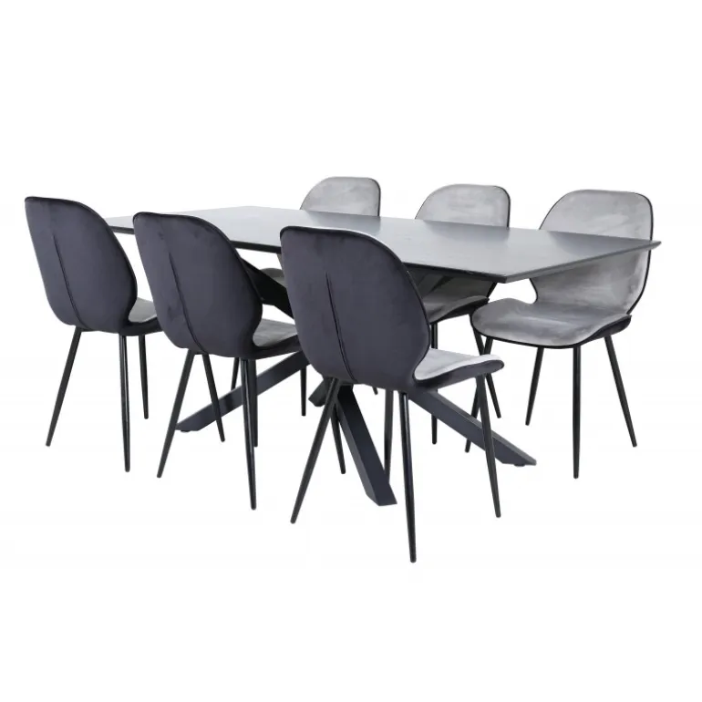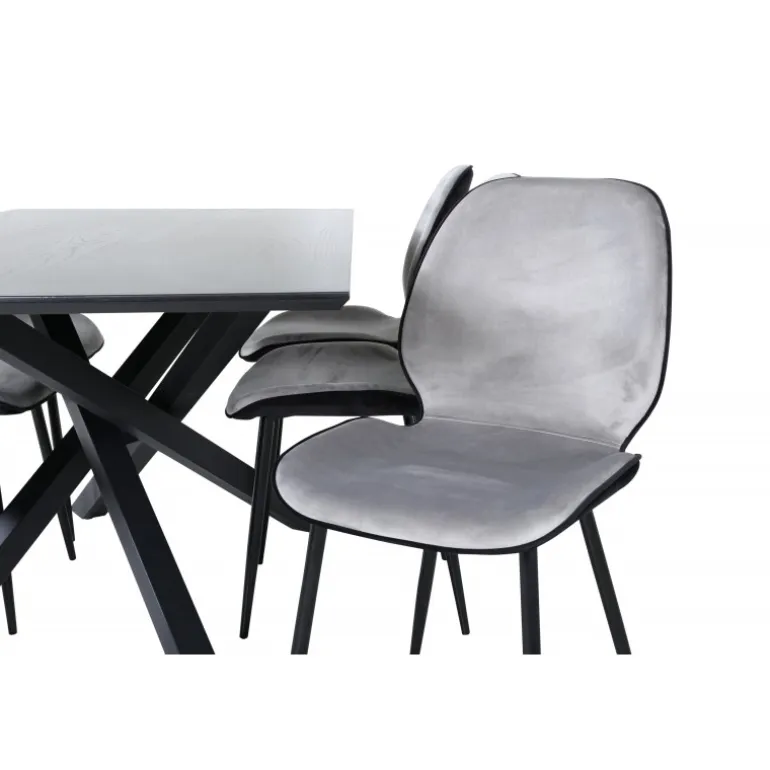 Vores populære Emma spisebordsstole fra Smaster Design! Stolene har et figureret og stilfuldt design med et sæde i lys grå fløjl og en ryg i sort fløjl samt stoleben i jern. Her sammen med vores populære Piazza spisebord. Bordpladen er lavet af MDF-finer i en smurt sort farve, og kroppen skaber en stabil iøjnefaldende effekt med krydsben i sort jern. Et trendy Spisebordssæt med alt det rigtige!