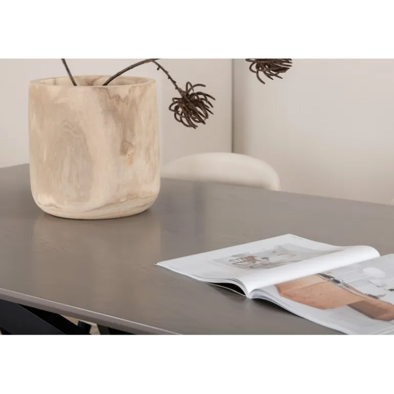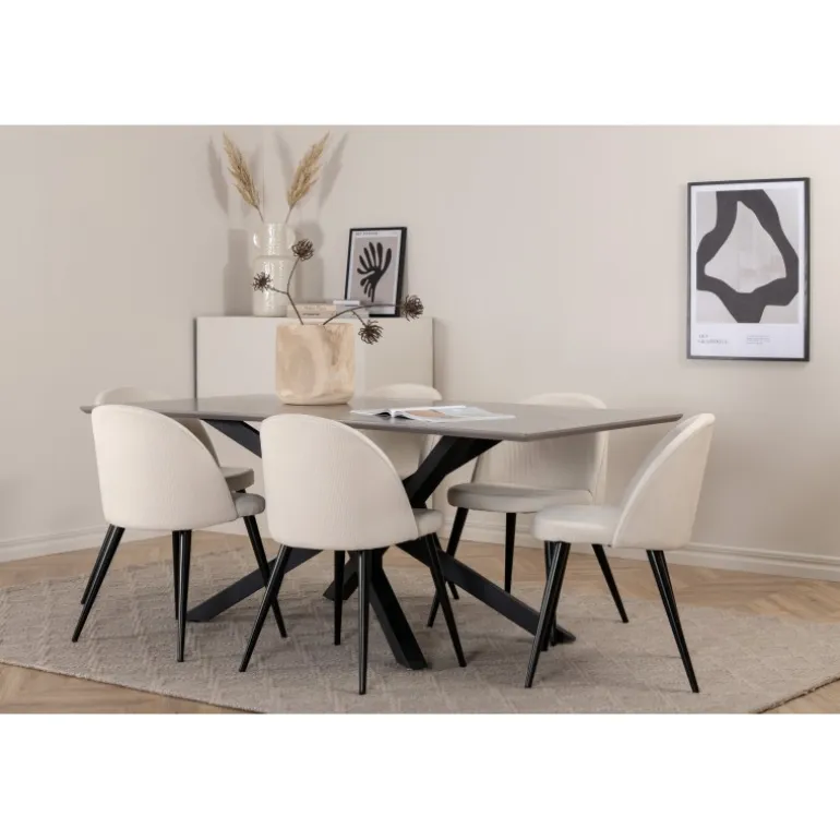 Piazza er vores populære rektangulære spisebord med luksuriøs følelse og trendy detaljer i designet. Bordpladen er lavet af MDF-finer i en tikkergrå farve, og kroppen skaber en stabil blikfang med krydsben i sort jern. Her i lækker kombination med spisebordsstole fra Velvet-serien, som bidrager til en smuk helhed i stuen. Stolebenene er let udadgående i sort jern, og sæderne er fuldt beklædt med beige fløjlstof. Skab en hjemlig atmosfære med et charmerende Spisebordssæt!