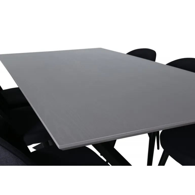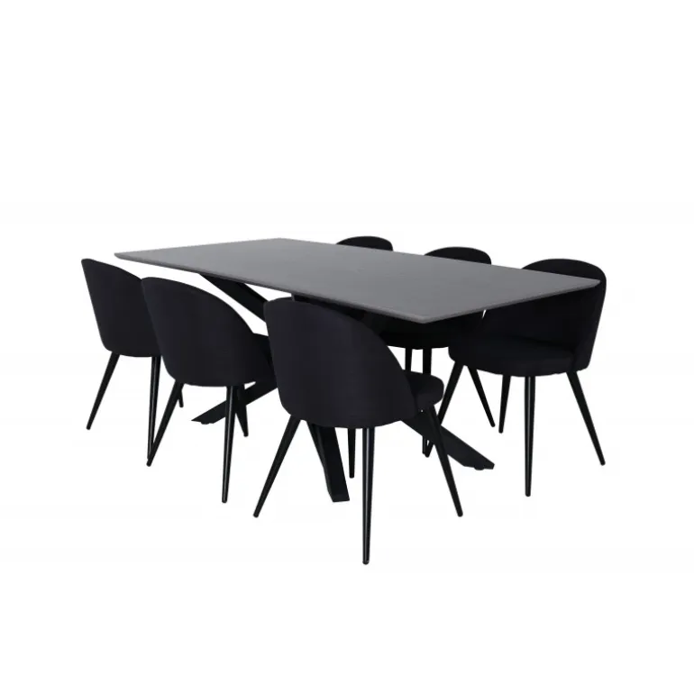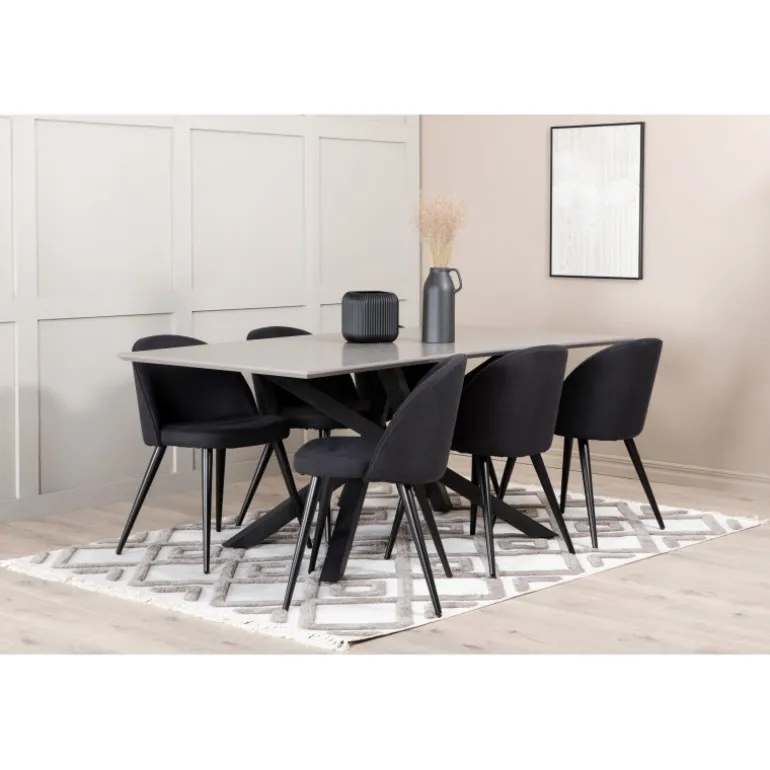 Pynt hjemmets hjerte med vores designbord Piazza og nyd dejlige måltider! Piazza er et rektangulært bord med en grå bordplade lavet af MDF og har en dekorativ ramme med sorte jernkrydsben, som skaber en stabil blikfanger. Bordets dimensioner: Længde: 190 cm, Bredde: 90 cm, Højde: 76 cm. Her sammen med 6 velour spisestole i sort polyester og udsvajede metalstoleben. Stolens dimensioner: Højde: 76,5 cm, sædehøjde: 46,5 cm, bredde: 50 cm, dybde: 57 cm. Indret med guldkant i hverdagen – det skal føles rart at komme hjem!