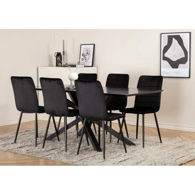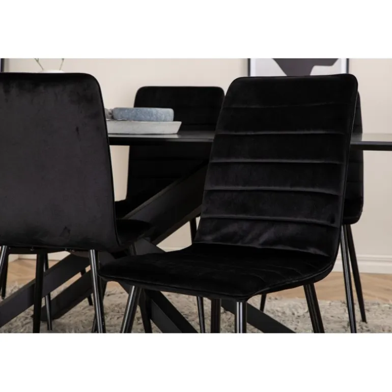 En fuld sort madgruppe går aldrig af mode! Piazza er vores populære rektangulære spisebord med luksuriøs fornemmelse og trendy detaljer i designet. Bordpladen er lavet af MDF-finér i en smurt sort farve, og kroppen skaber en stabil blikfang med krydsben i sort jern. Her sammen med 6 Windu luksus spisebordsstole i lige design. Stolene har sorte sæder i fløjl, som giver en flot glans til rummet, og smalle stoleben i jern. Her sidder du og dine gæster komfortabelt i lang tid!