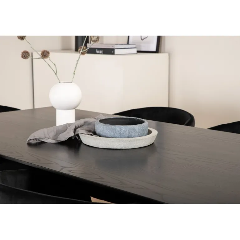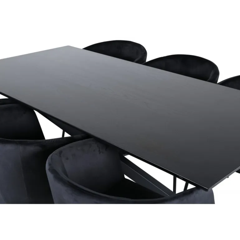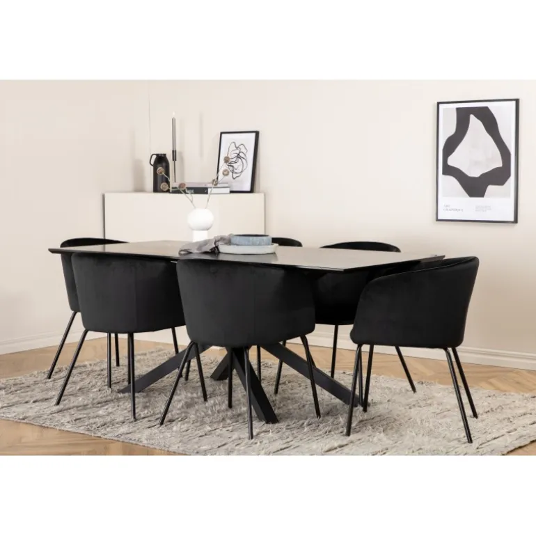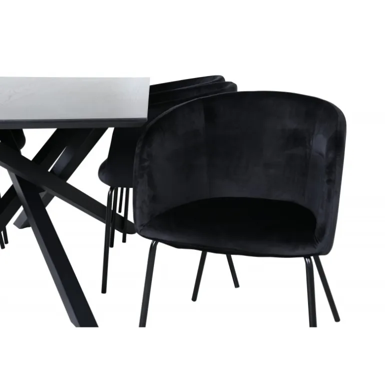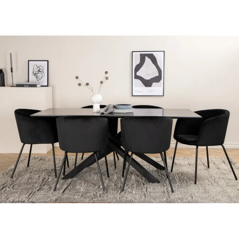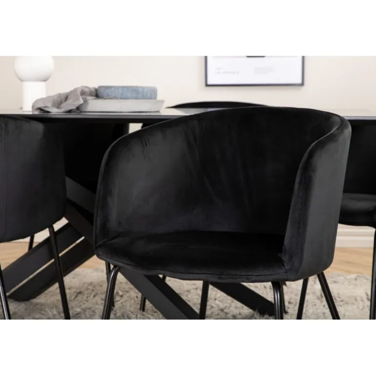 Piazza Rektangulært Spisebordssæt er det perfekte valg til at skabe en trendy og indbydende atmosfære i dit hjem. Piazza er vores populære rektangulære spisebord med en luksuriøs følelse og trendy detaljer i designet. Bordpladen er lavet af MDF-finer i en flot sort farve, og stellet danner en stabil blikfanger med krydsben i sort jern. Sættet kombineres smukt med vores elegante spisebordsstole fra Berit-serien. Stolen har et luksuriøst design i sort fløjlstof, og stolebenene er stilfuldt slanke i sort jern. Indret din spisestue med stil og skab et moderne look!