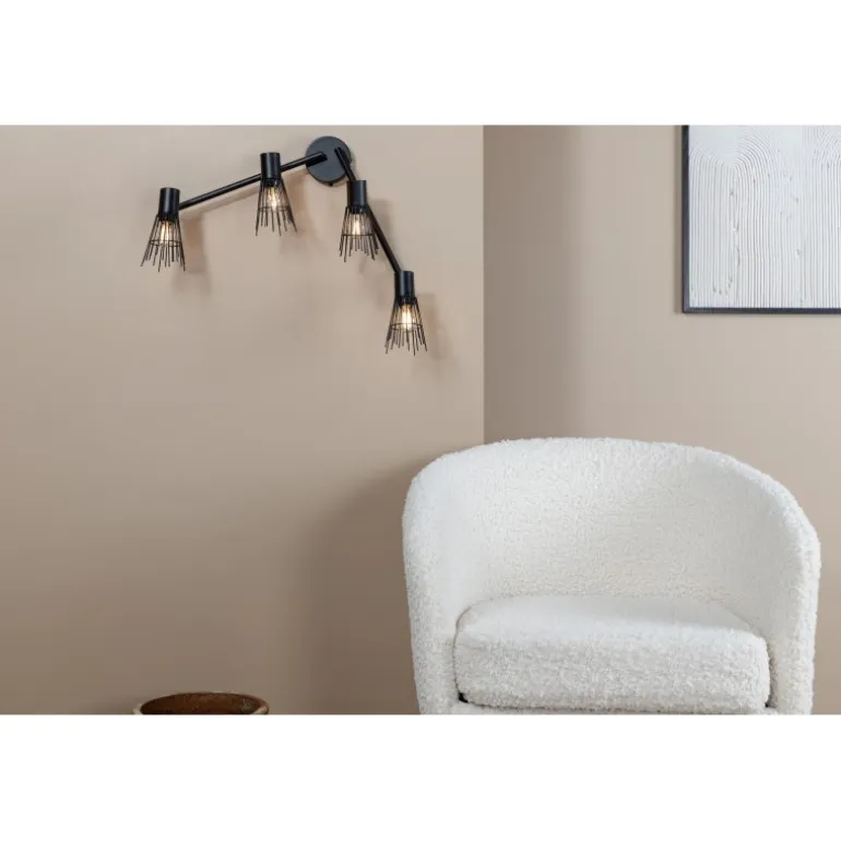 Med Pico væglampen får du både praktisk og stilfuld belysning! Beslaget har et enkelt design i sort stål og fire lyskilder. Lampeskærmene har et dekorativt design, der gør lampen unik. Både lyskilderne og armene kan justeres afhængig af smag og anvendelsesområde, hvilket gør lampen meget anvendelig. Placer den i gangen, stuen eller hvor der ønskes punktbelysning. Ved installation: En såkaldt fast installation kræves, som kun må udføres af en elektriker.