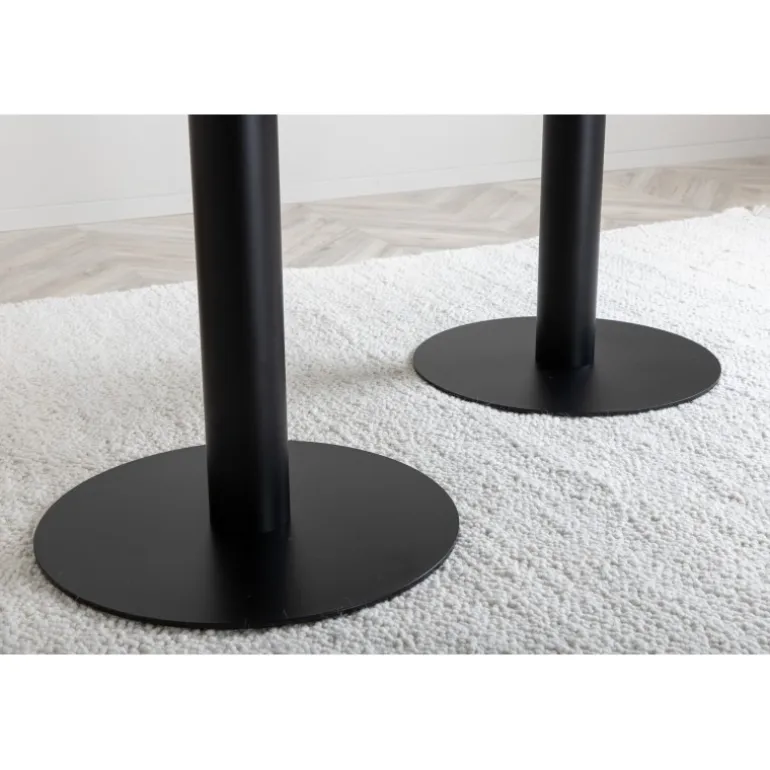 Et ovalt designbord, der fanger øjet og imponerer med sin stilfulde elegance. Ovalt spisebordet Pillan giver et luksuriøst indtryk med sin smalle bordplade i MDF-finér med naturligt marmormønster og trompetfod i metal. Den sorte farve er både praktisk og tidløs og let at matche med anden indretning. Kombiner med et par komfortable spisebordsstole, og du vil få en komplet Spisebordssæt til alle ugens måltider! Plejeråd: MDF-skiver, der er malet eller lakeret, er følsomme over for ridser og skader. Vær derfor forsigtig med skiverne for at undgå dette. Overflader malet med lak med farvepigment eller maling har en pigmentering, der giver en ikke-dækkende transparent overflade.