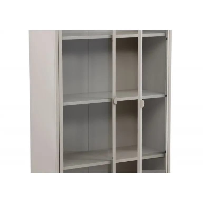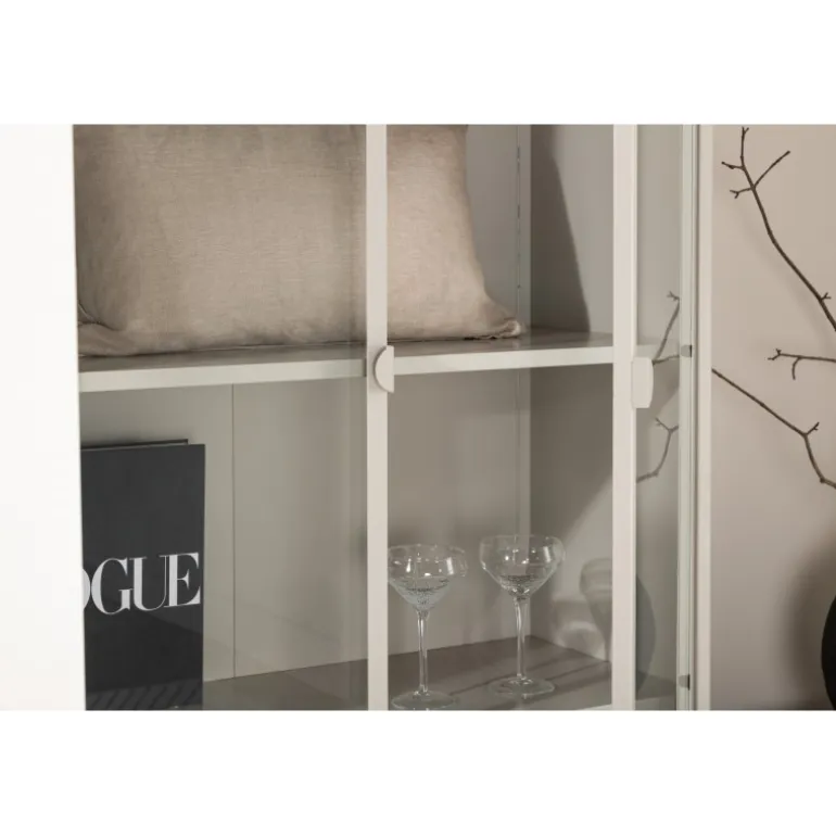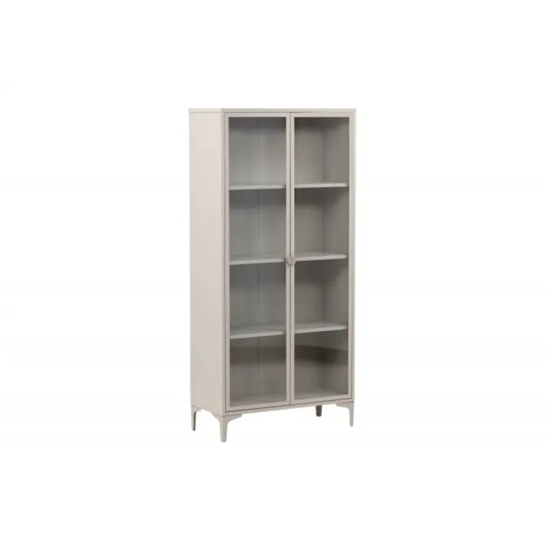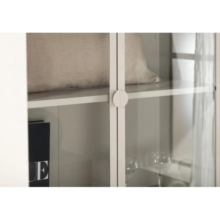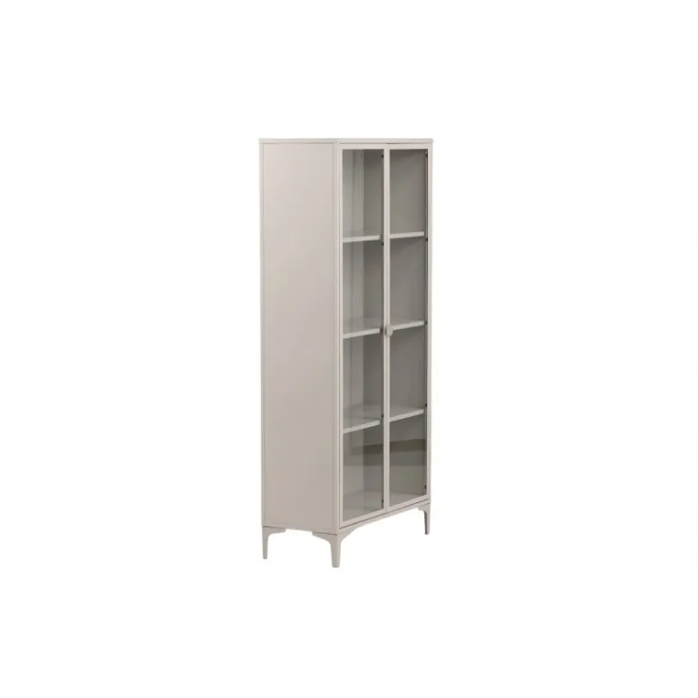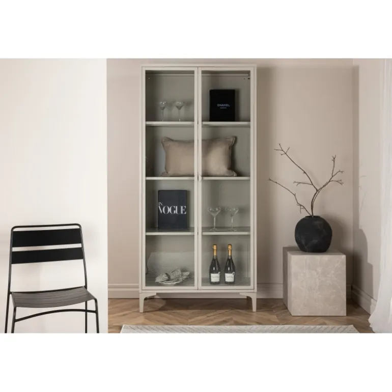 Piring Vitrineskab er en populær tilføjelse til din indretning med elegante opbevaringsmuligheder! Vitrineskabet fra Piring-serien har et moderne design med lige strukturer, lavet af pulverlakeret beige stål. Kabinetet har to høje glasdøre, som giver et dejligt lysindfald i kabinetet samt fire hylder til dit fine porcelæn eller smukke interiørdetaljer. Dette er et udstillingskabinet, der tilbyder det bedste af to verdener – vælg, hvad du vil vise frem, og hvad der har brug for smart opbevaring. Lettere samling kræves!