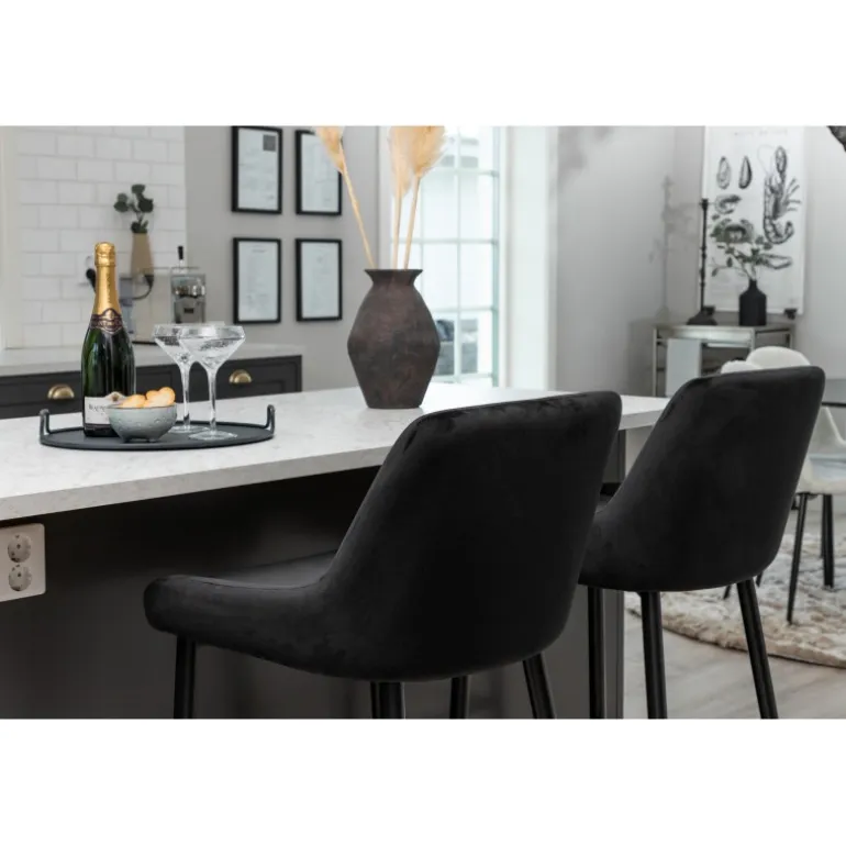 Gå ikke på kompromis med hverken design eller komfort med en barstol fra Plaza-serien! Designet er gennemtænkt med en fuldt polstret stol i sort fløjlsstof og slanke ben i sort pulverlakeret metal med en integreret fodstøtte for ekstra komfort. Nogle samling kræves. Plejeanvisning: Brug stofspray til at imprægnere stoffet inden brug, hvilket også gør det lettere at fjerne snavs og pletter i fremtiden. Fjern pletter straks, gnid ikke, men prøv forsigtigt at absorbere med en klud.