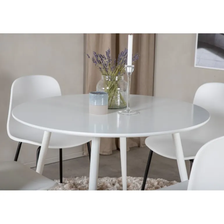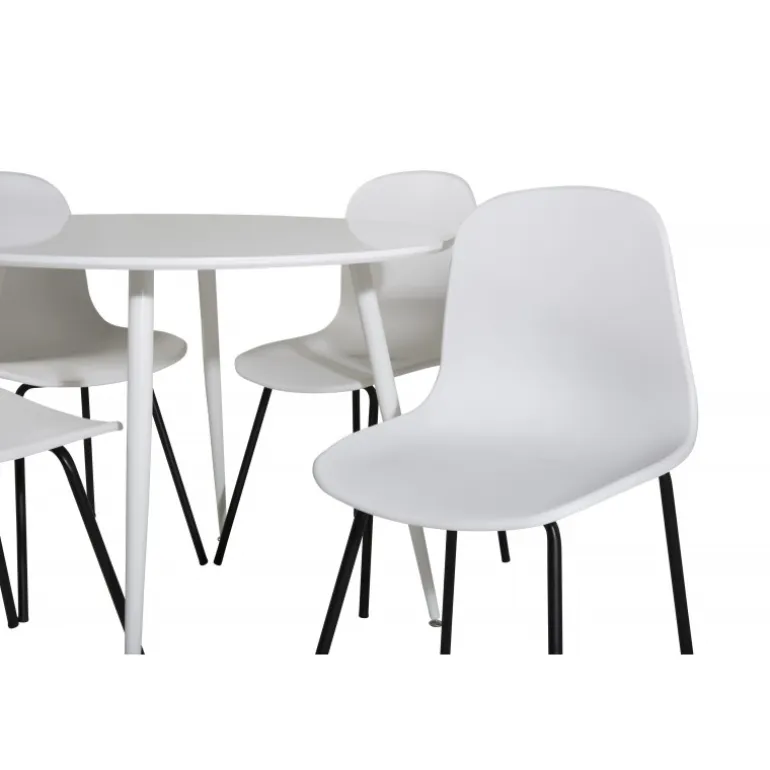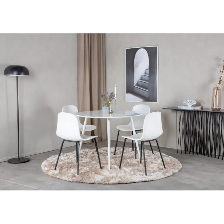 Forkæl dit hjem med et moderne og stilfuldt Plaza Rund Spisestuesæt. Dette sæt, bestående af Plaza spisebord og Arctic spisestuestole, er den perfekte kombination til hjemmets hjerte. Med sit elegante design passer det lige så godt til dine behov som til din øvrige indretning. Fremstillet af MDF, plast og stål, tilbyder dette sæt holdbarhed og komfort. Fås i klassiske farver som sort og hvid, og med inkluderede hynder for ekstra komfort.