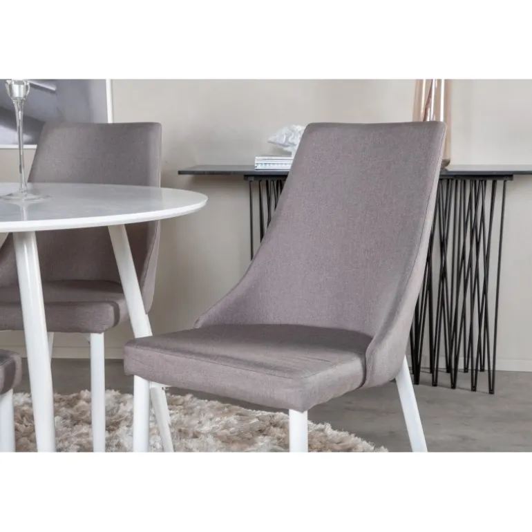 Klassisk Spisebordssæt, der passer ind i de fleste husholdninger! Spisebordet Plaza sammen med stole fra Leone-serien er ideelt for dem, der ønsker at skabe en hyggelig og moderne atmosfære i hjemmet. Spisebord i hvid MDF og stole i grå polyester med stålben giver et stilfuldt look, der passer til mange indretningsstile. Med dette sæt får du både komfort og æstetik samlet i ét.