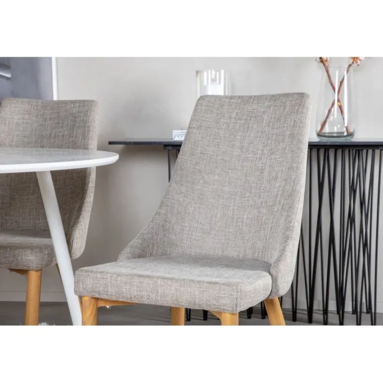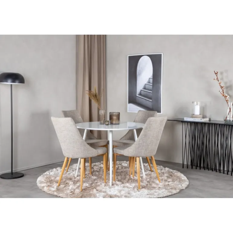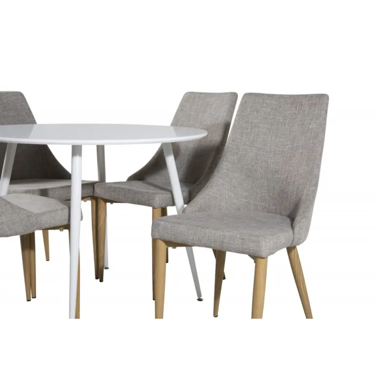- Moderne Design: Stilfuldt rund spisebord og komfortable stole, der passer ind i enhver moderne indretning.