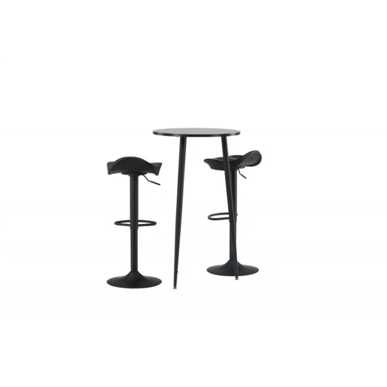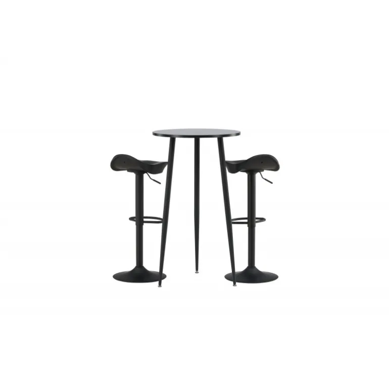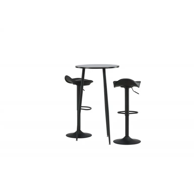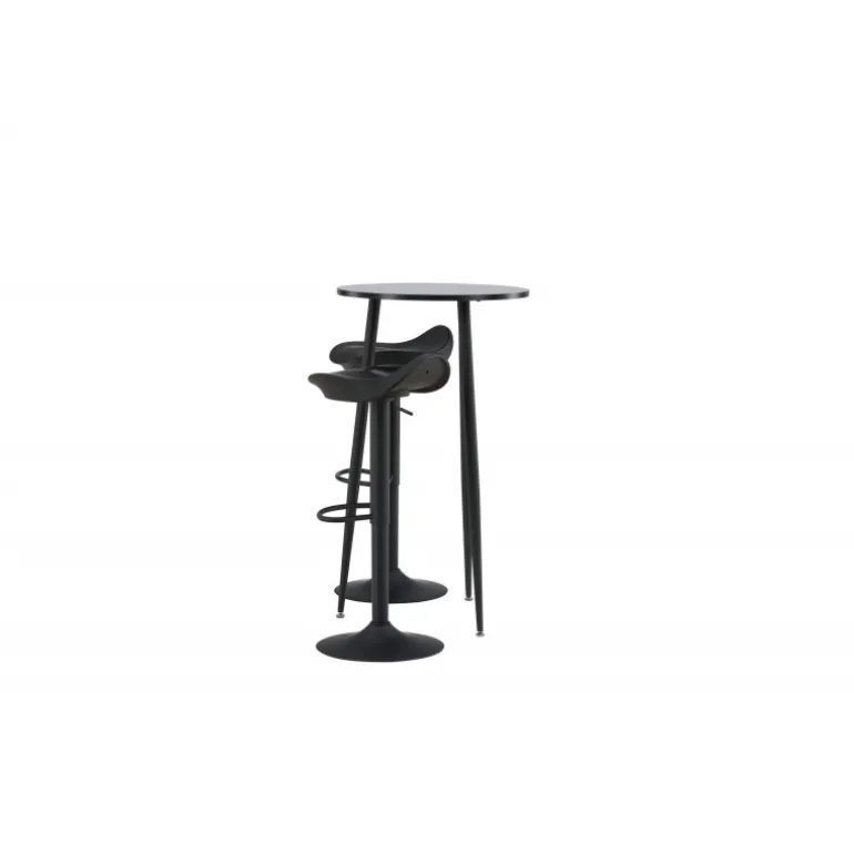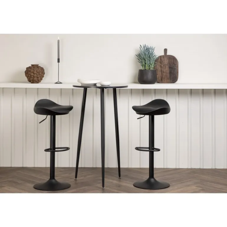 Moderne, praktisk og tidløst – et barsæt, der passer perfekt i det mindre køkken! Her kombinerer vi barstole fra Adesto-serien med vores stilfulde barbord Plaza. Barstolen har et tidløst design med en sort ståltrumpetfod og et komfortabelt sæde i sort plast. Barbordet har en rund bordplade i sort MDF og let udstående bordben i sort metal. Placer barsættet i køkkenet eller hvor der er behov for ekstra siddepladser og nyd lange, vidunderlige stunder med familie og venner!